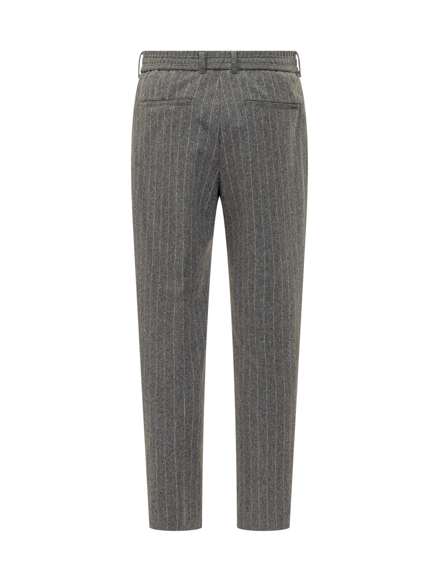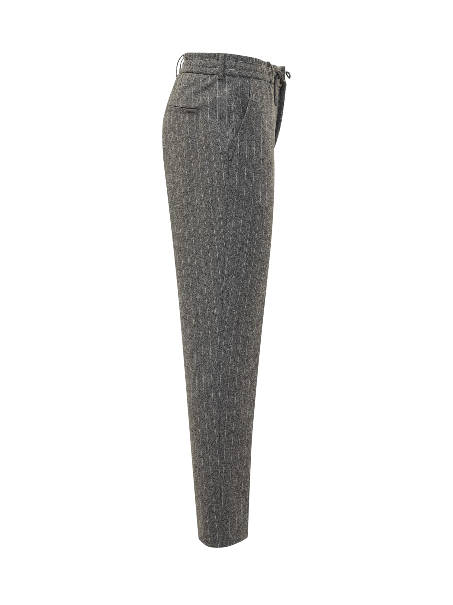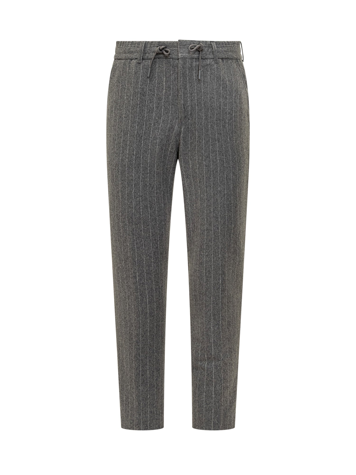 Boss grey wool pinstripe pants with zip and button closure and adjustable drawstring waist.