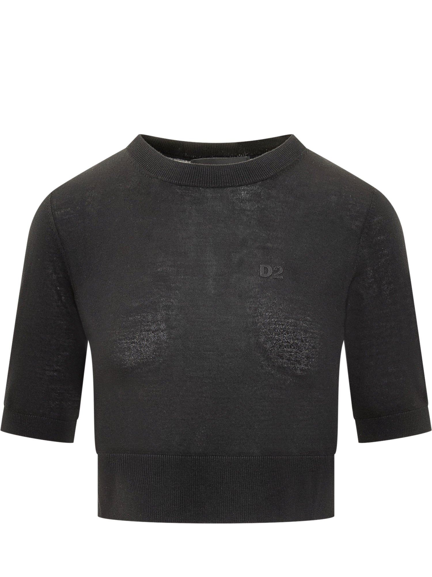 Black DSQUARED2 crewneck pullover in lightweight knit with tonal logo. Slim fit and short sleeves.