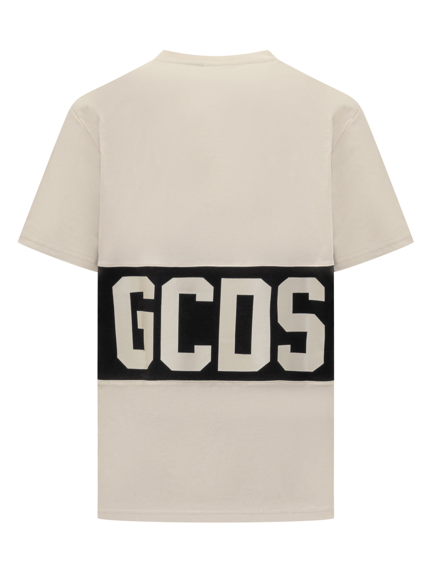 GCDS beige cotton T-shirt with contrasting black band and bold front logo.