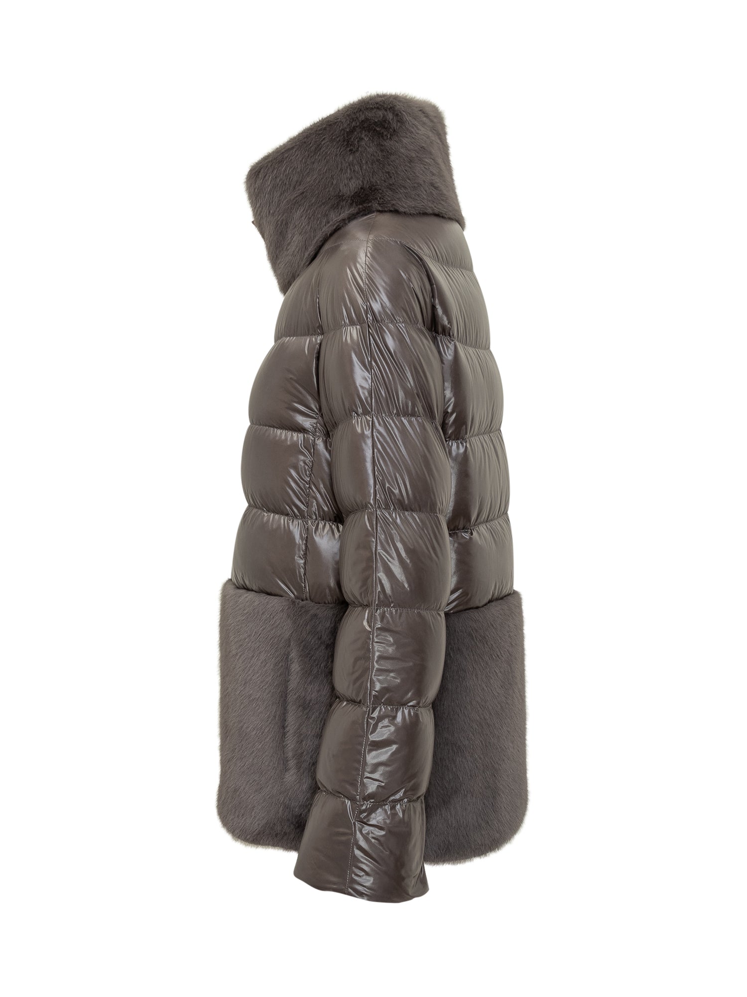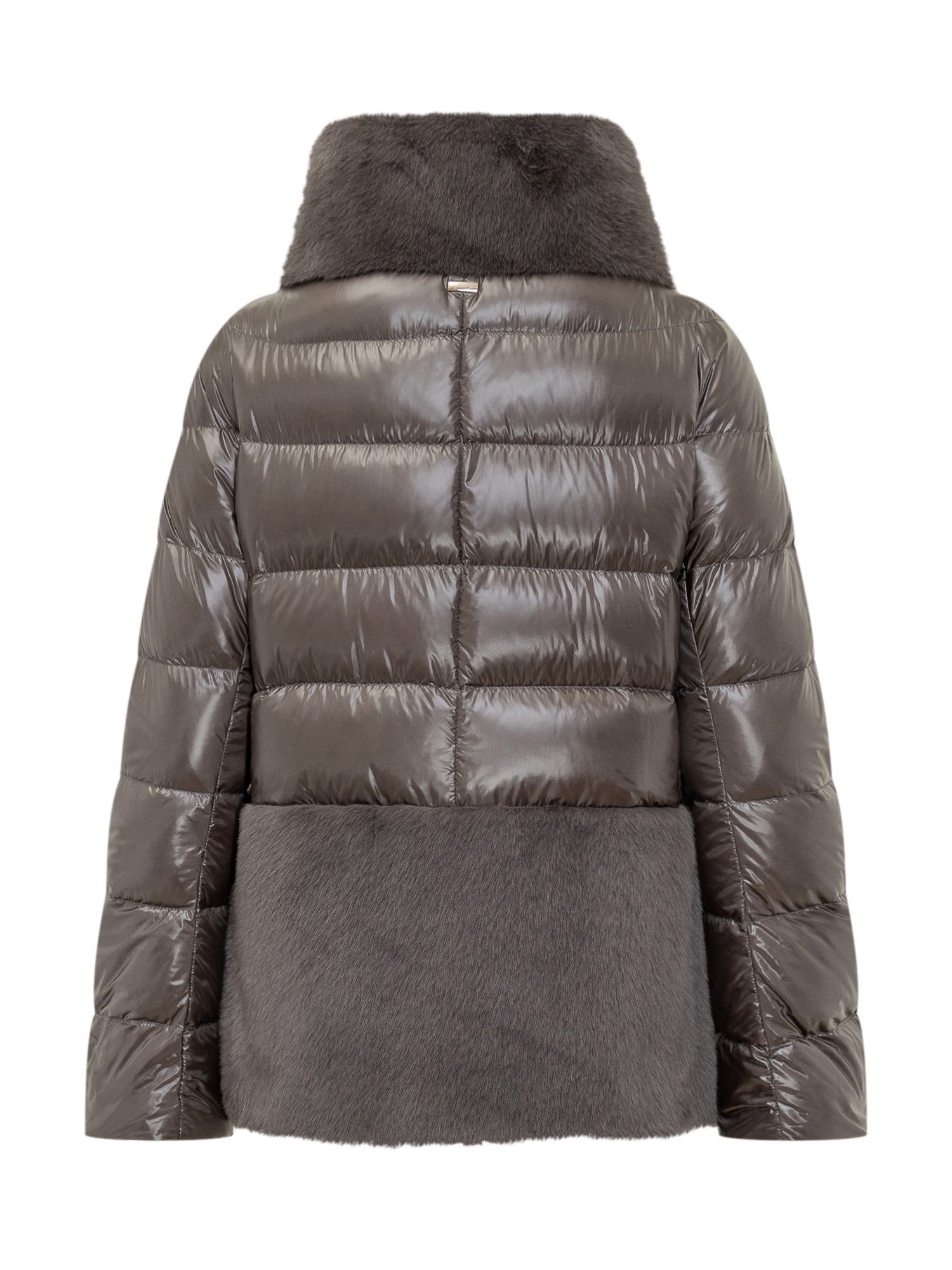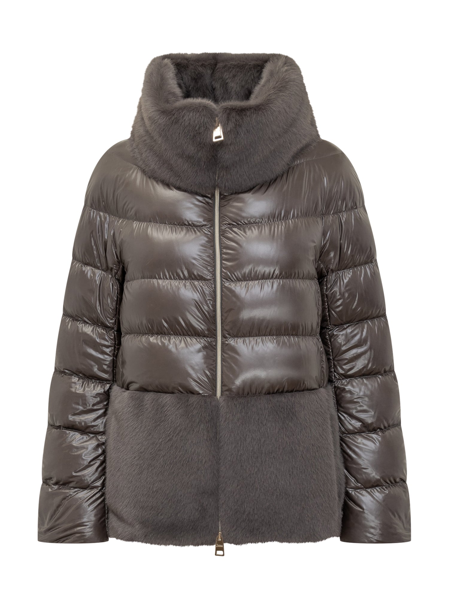 Herno grey glossy down jacket with fur inserts and front zip closure.