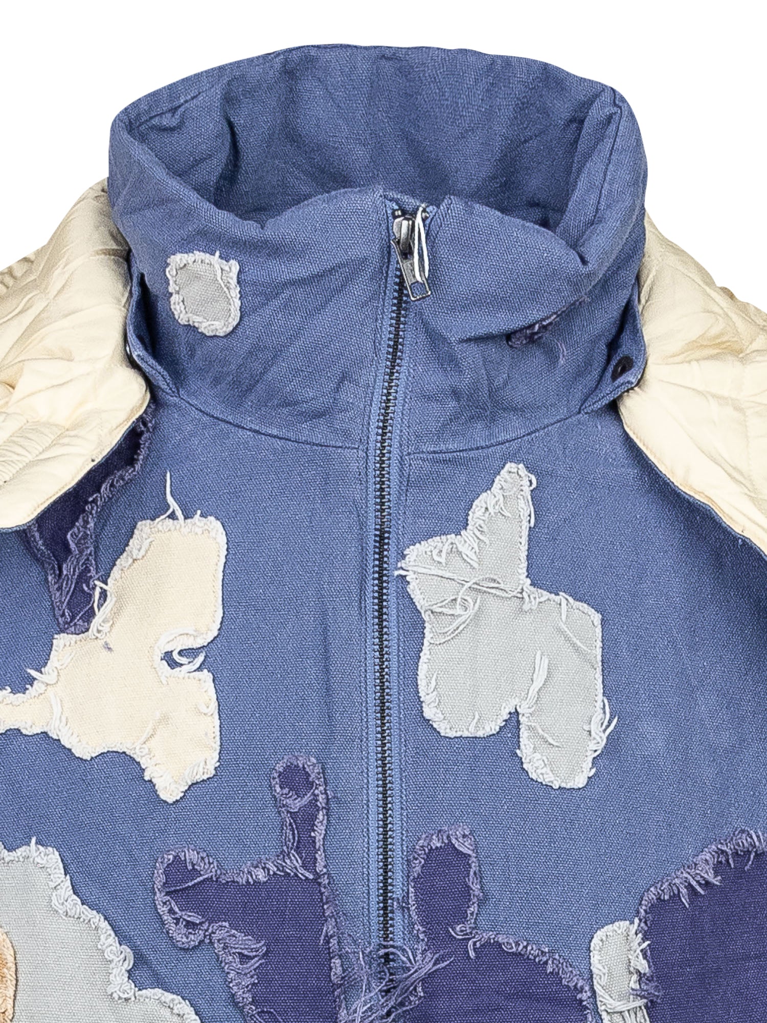 Long-sleeved cotton jacket. High neck. Hood with drawstring. Zip closure. Cuffs with button. Patch all over. Face pattern on the front.