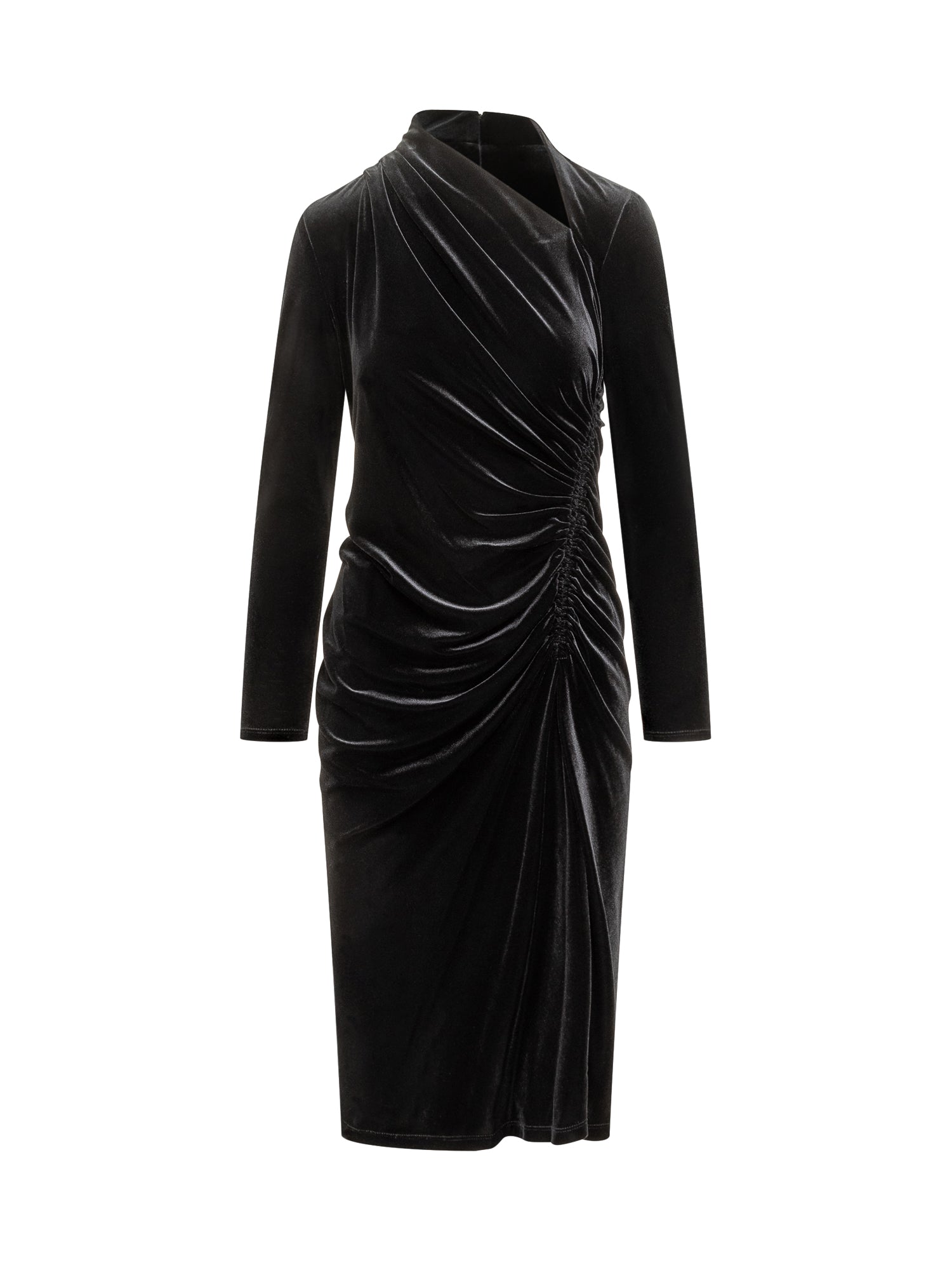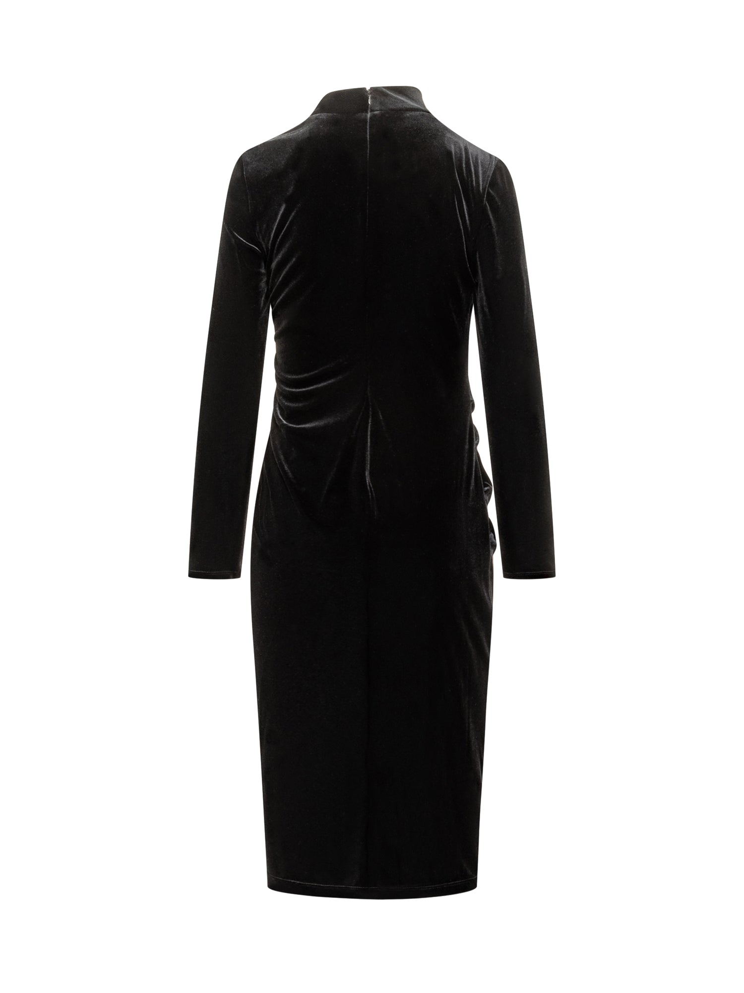 Elegant Lauren Ralph Lauren black velvet dress featuring side draping and long sleeves.