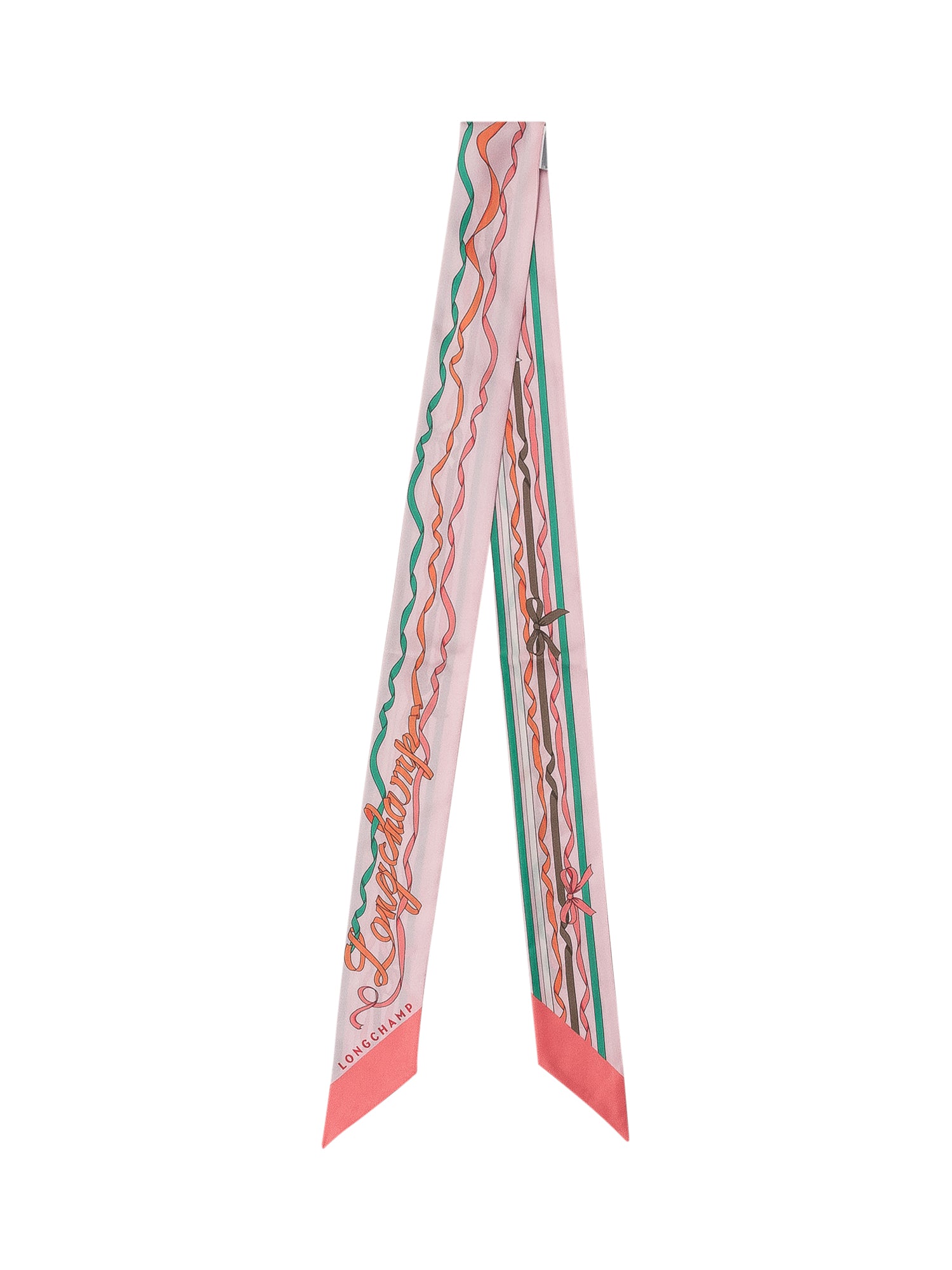 Long bandeau scarf featuring a graphic print with flowing ribbon motifs and decorative details.