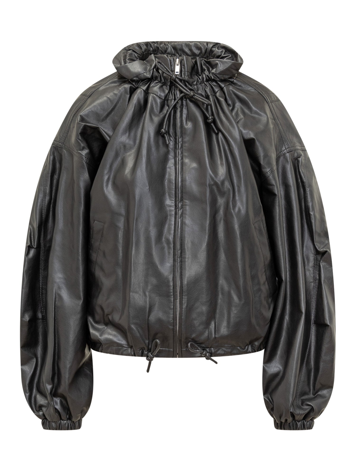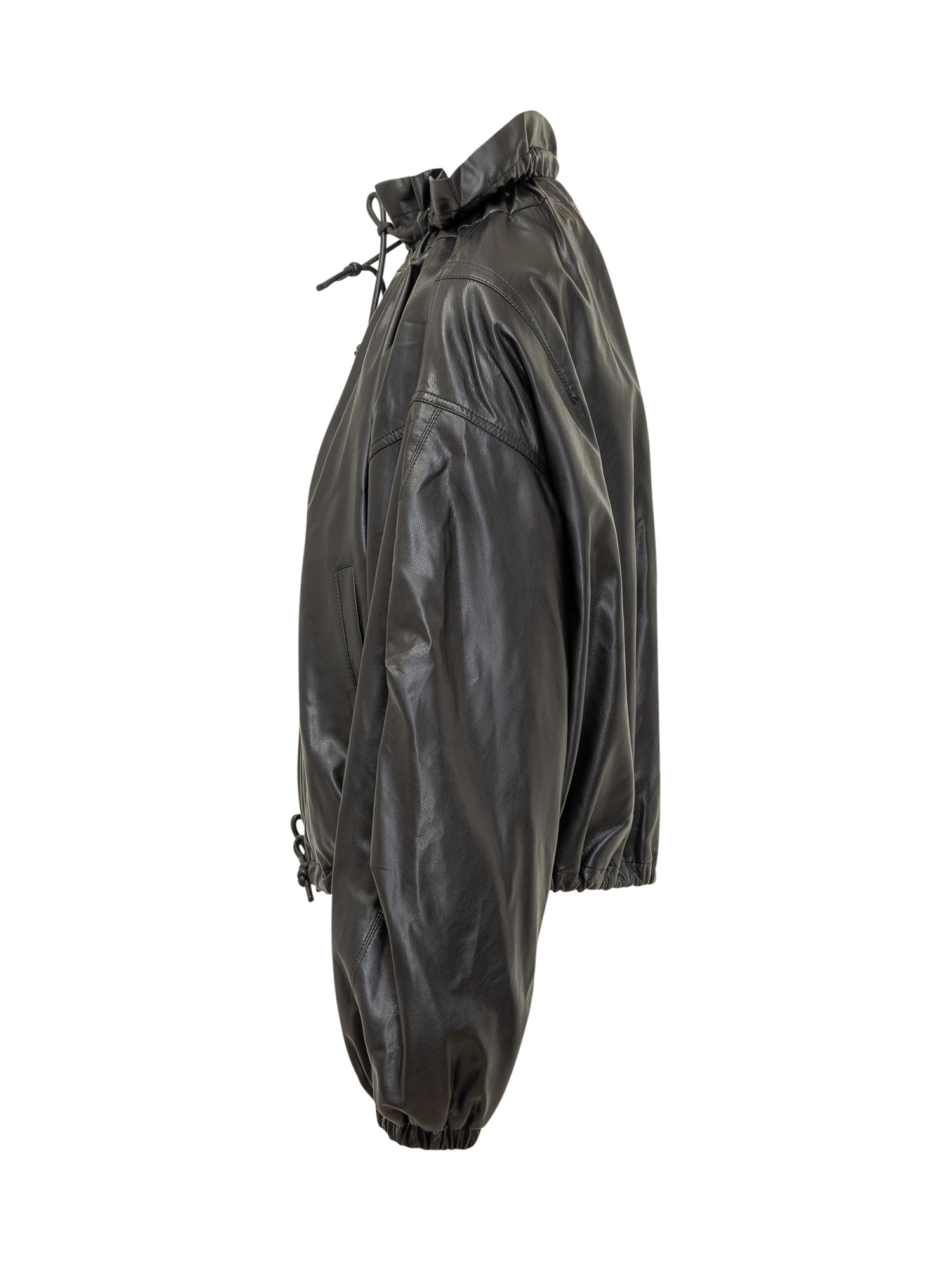 Soft-volume leather jacket featuring adjustable drawstrings at neck and hem.