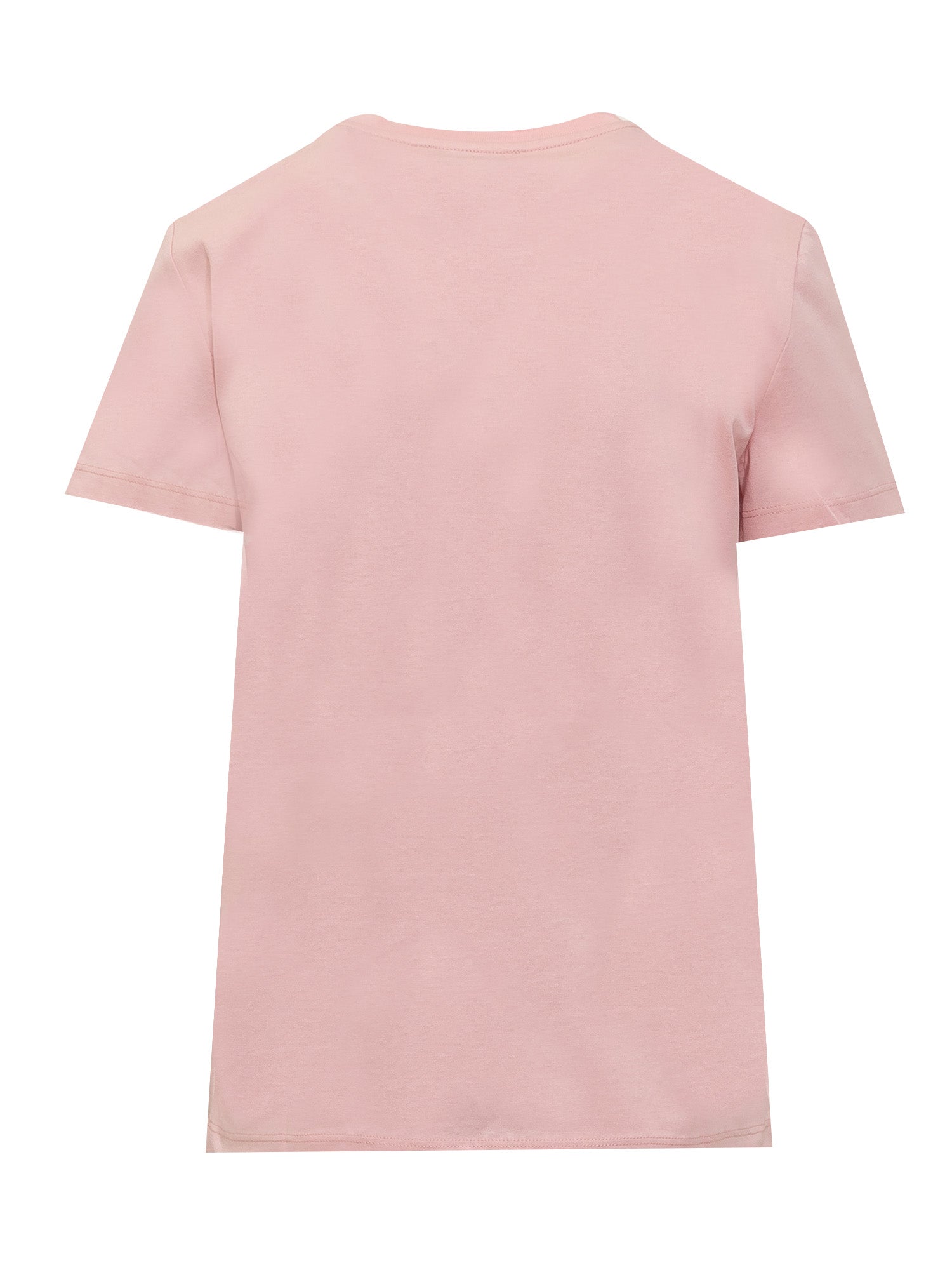 Short sleeve cotton t-shirt. Crew neck. Ribbed hems. Chest pocket. M Monogram motif in crystals and embroidery, Teddy bear and gold dragon on the front. Straight line.