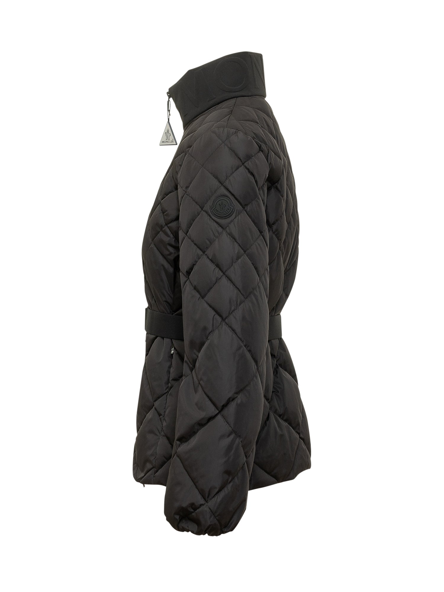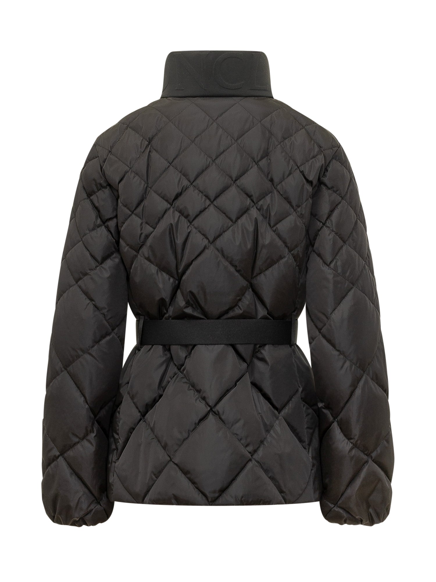 Quilted jacket with high collar and front zip closure. Waist belt for a defined silhouette.