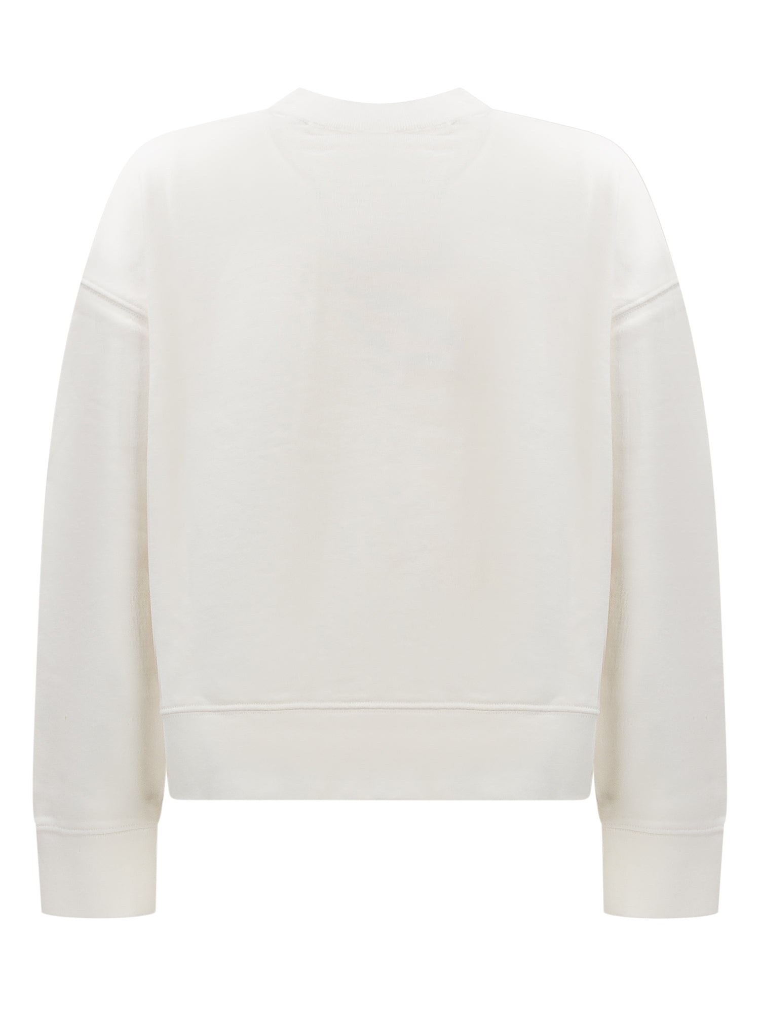 White long-sleeved sweatshirt. Ribbed collar and hem. Artistic holding heart print with Keith Haring heart symbol and Palm Angels logo on front.