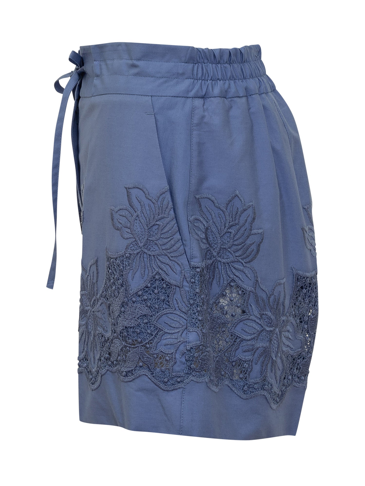 Blue cotton shorts. Embroidered bottom. Elastic waistband. Side pockets. Drawstring closure.