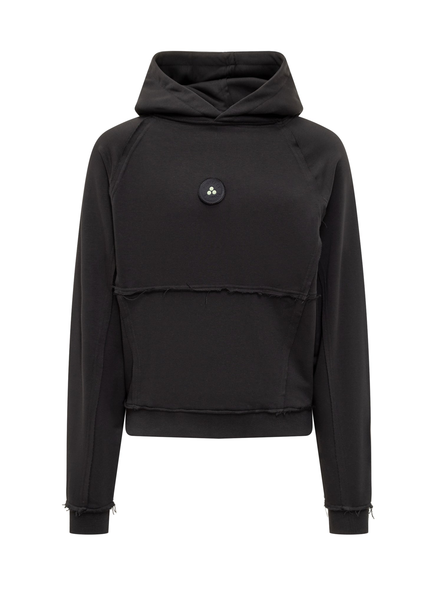 Peuterey black cotton hoodie featuring a circular logo on the chest. Frayed details and raw-edge finish.