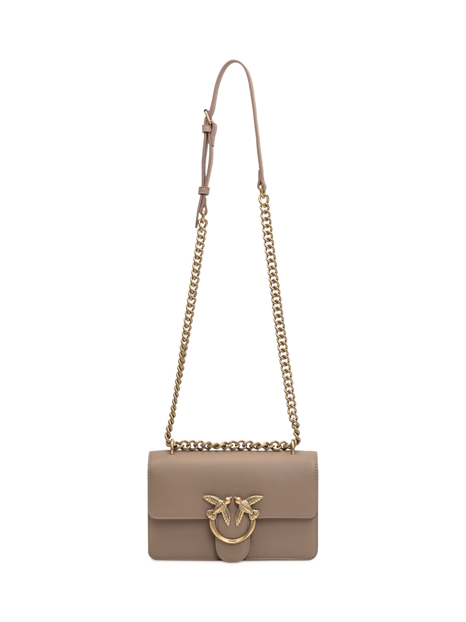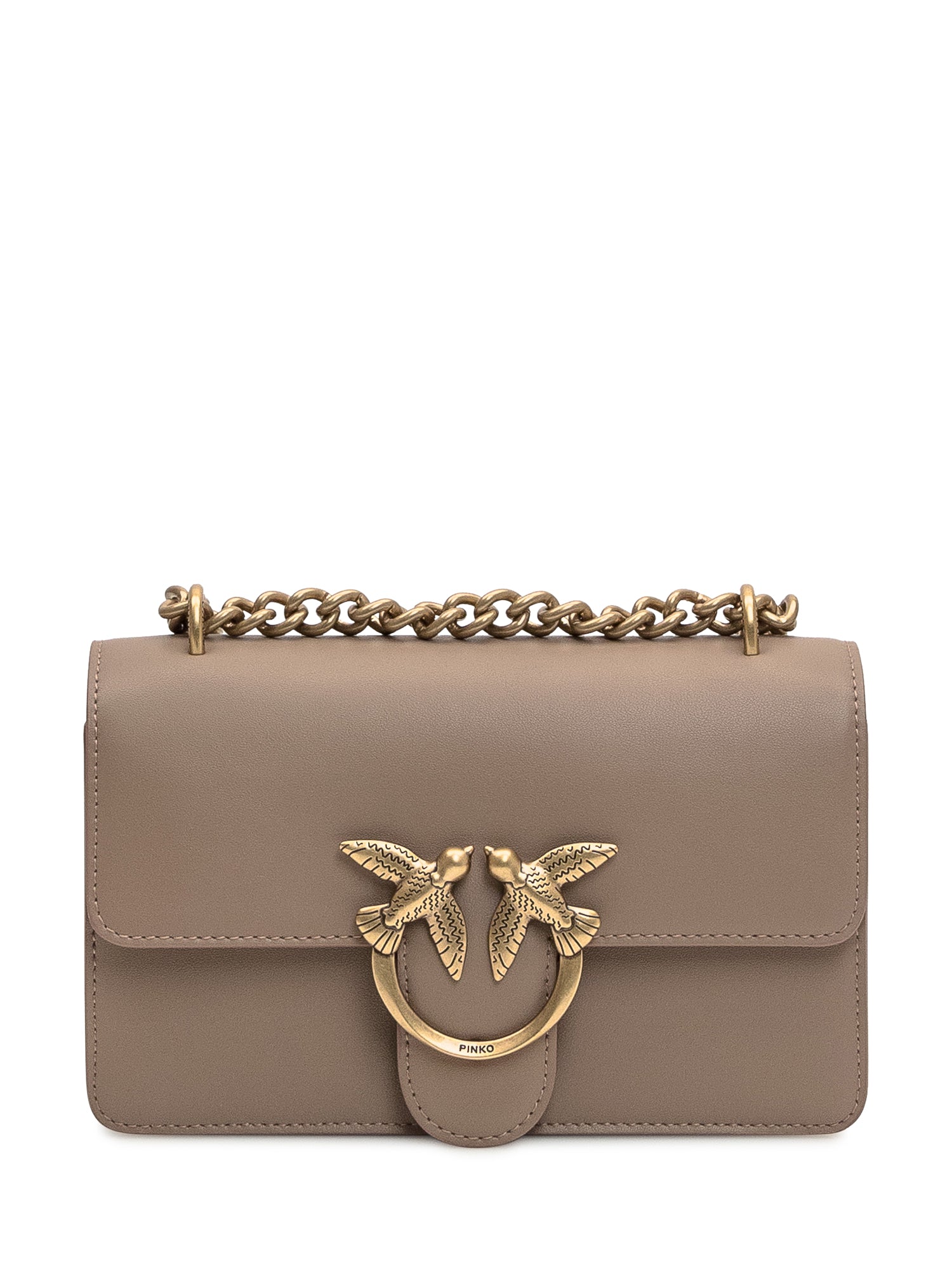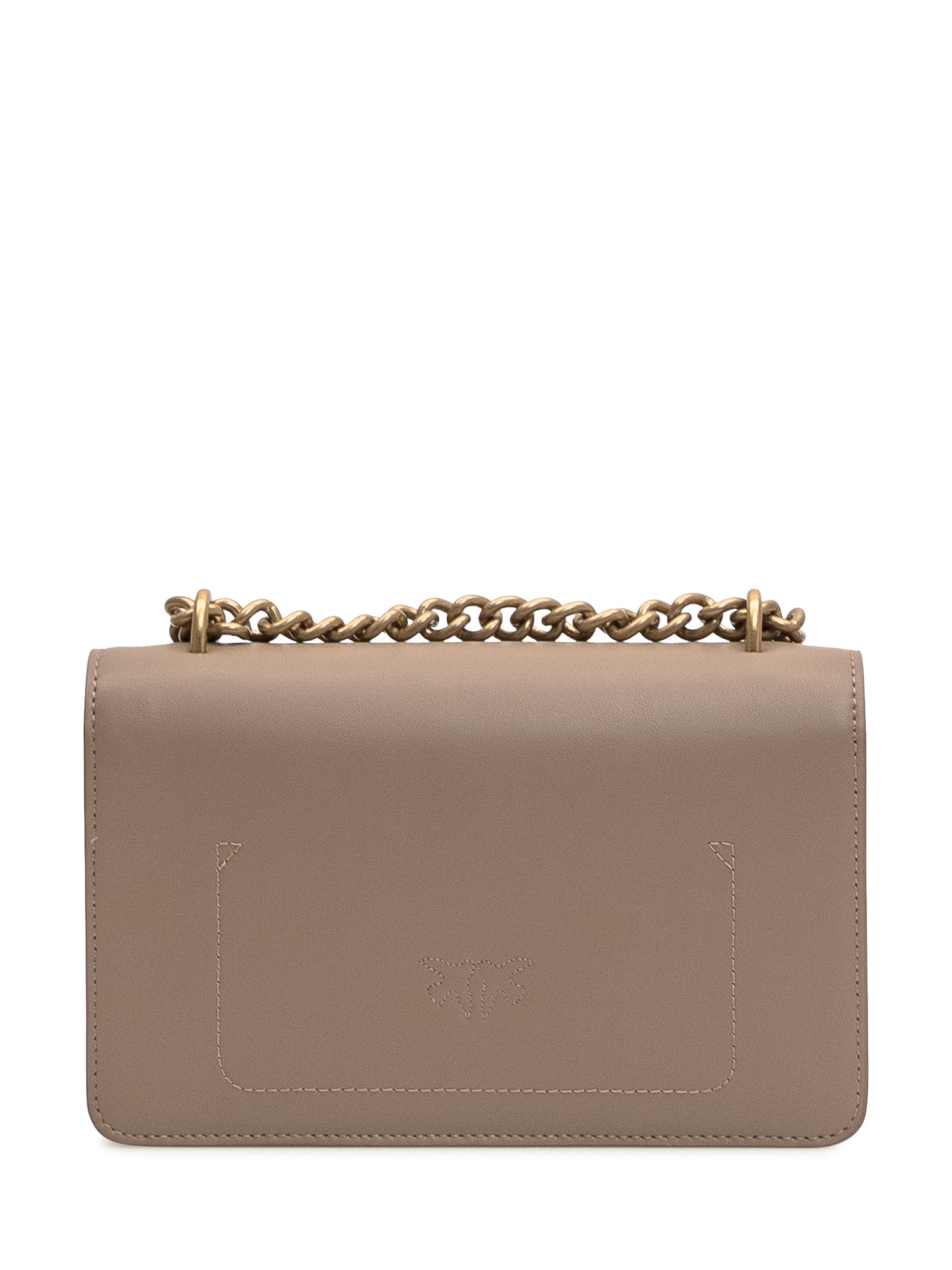Brown bag. Chain shoulder strap. Flap and snap closure. Two compartments with zip pocket. Logo buckle on the front.