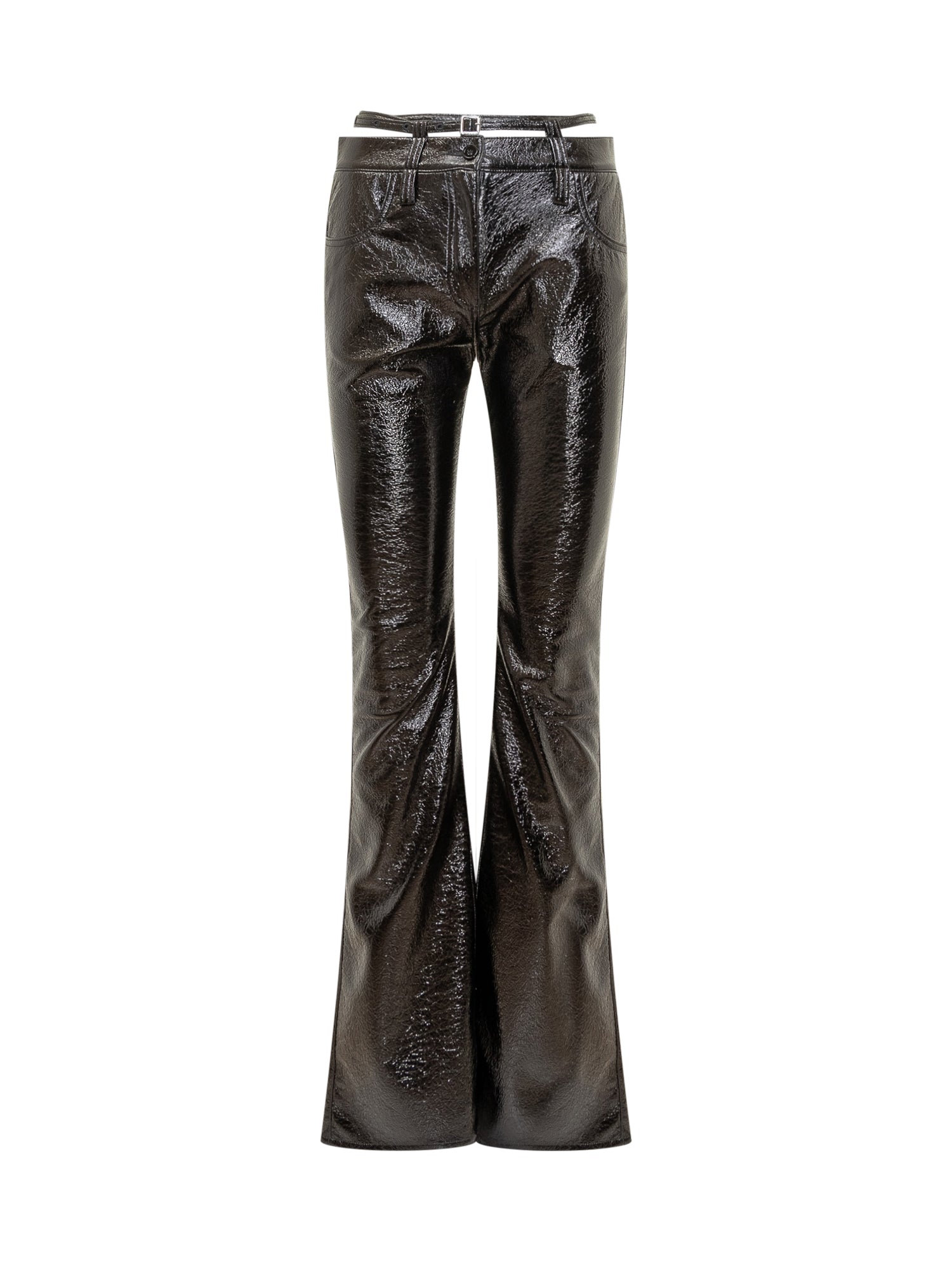 Pinko Rocio flared pants featuring a glossy patent-effect finish. The high-waist cut enhances the silhouette.