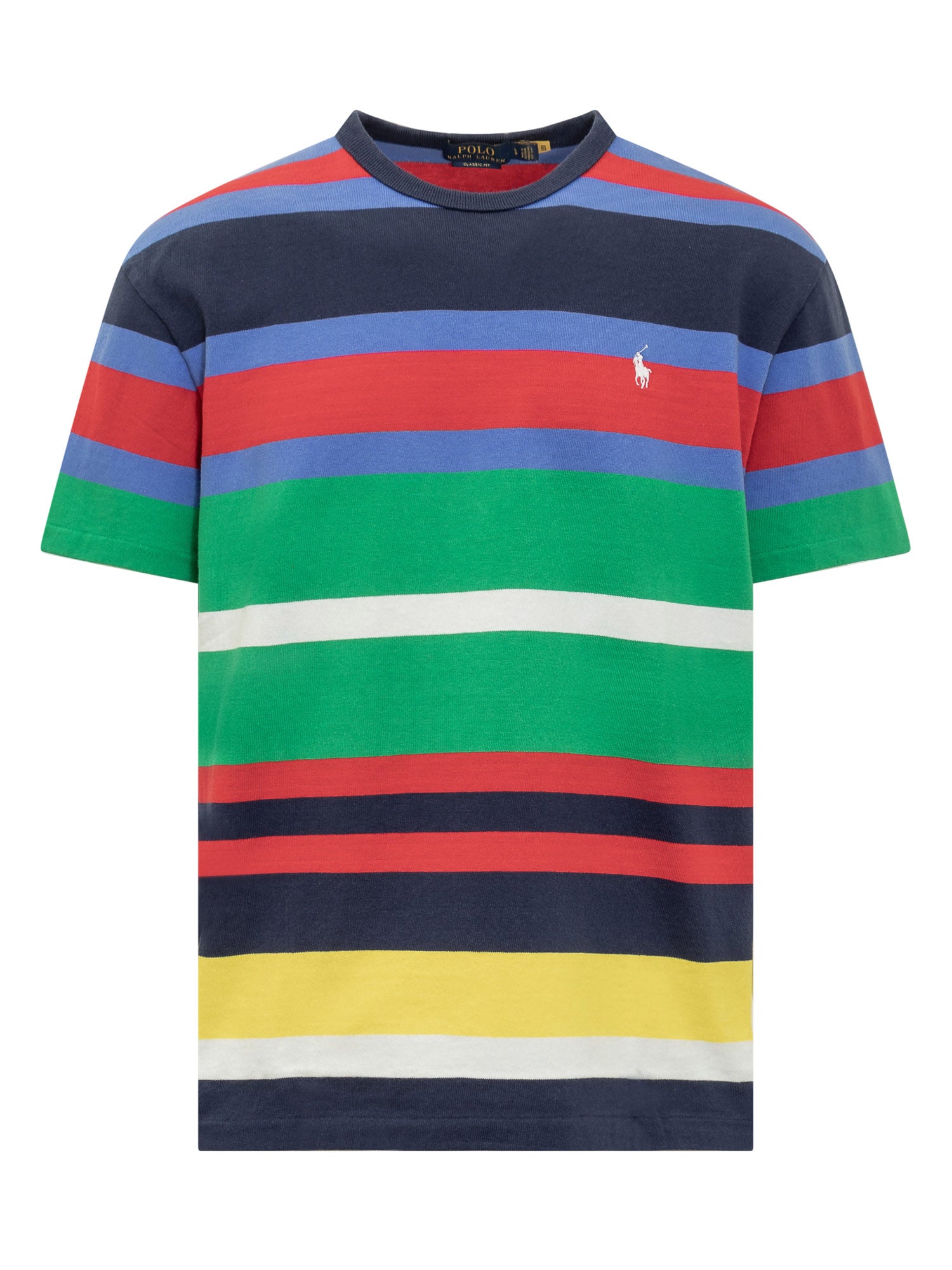 Crewneck t-shirt. Embroidered logo on the chest. Ribbed neck. Stripped print.