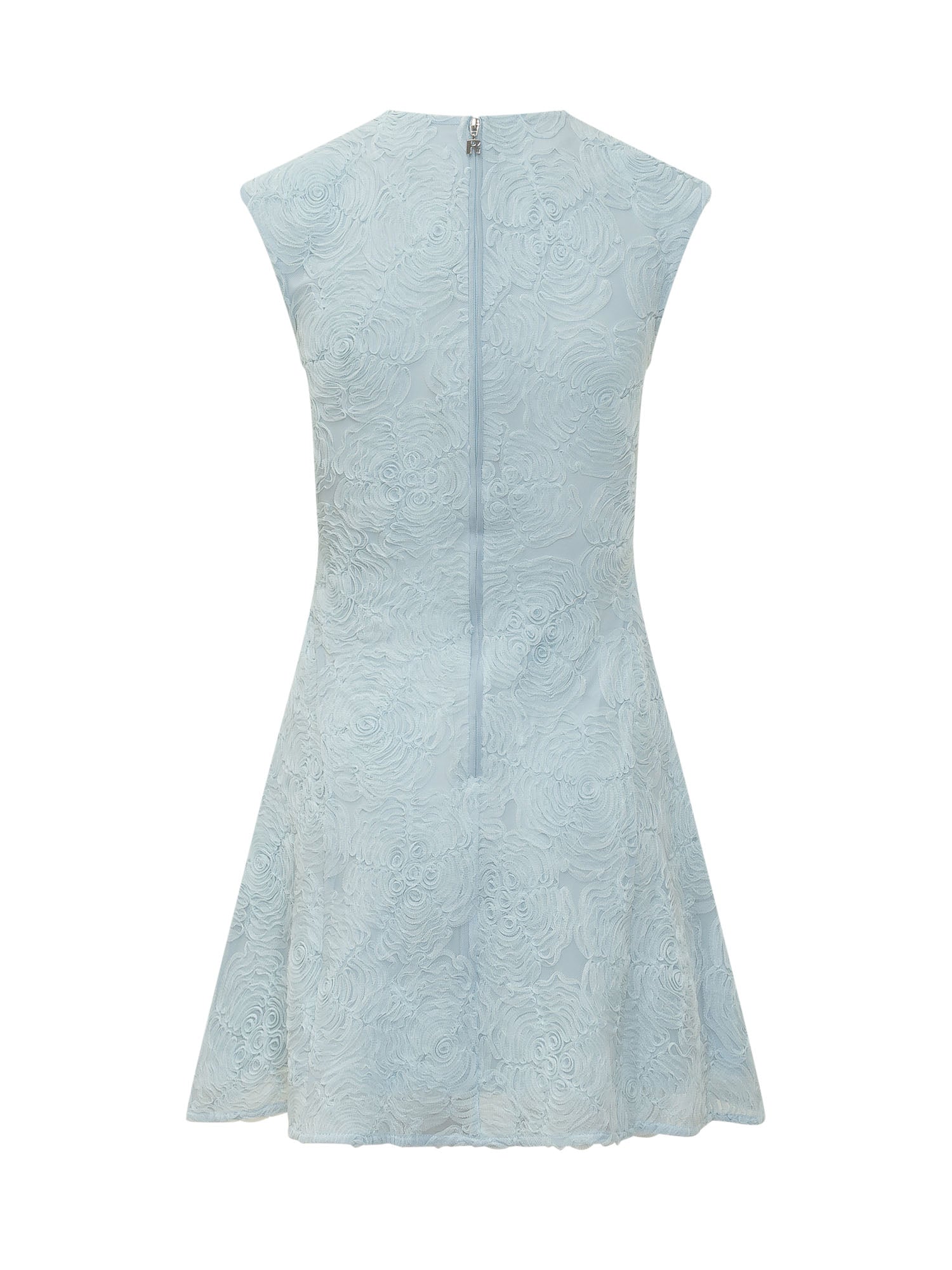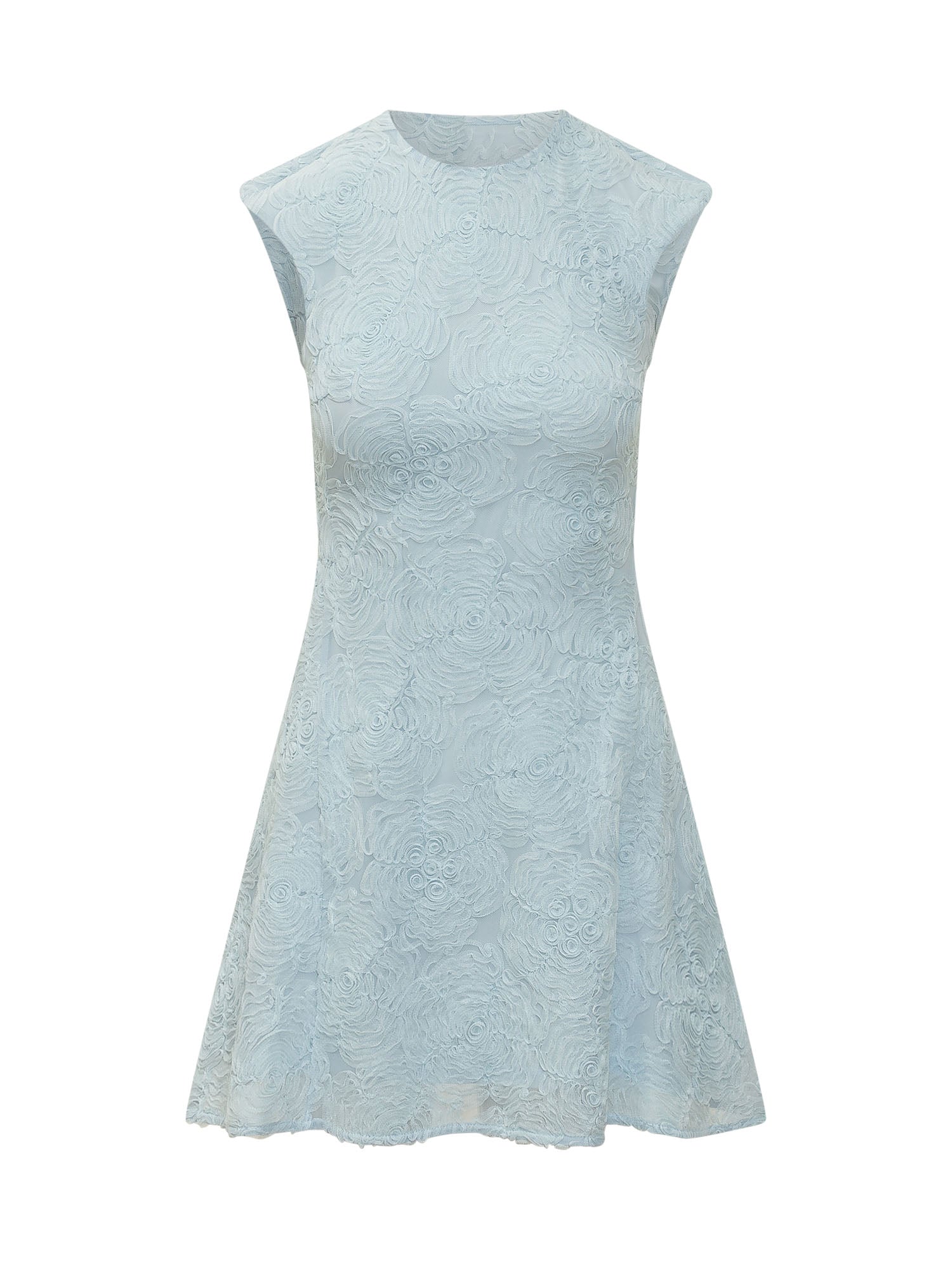 Mini dress crafted from mesh with refined all-over embroidery creating an elegant three-dimensional pattern. The model features a slightly flared silhouette with a round neckline and structured shoulders for a feminine and sophisticated look. Perfect for special occasions or elegant events.