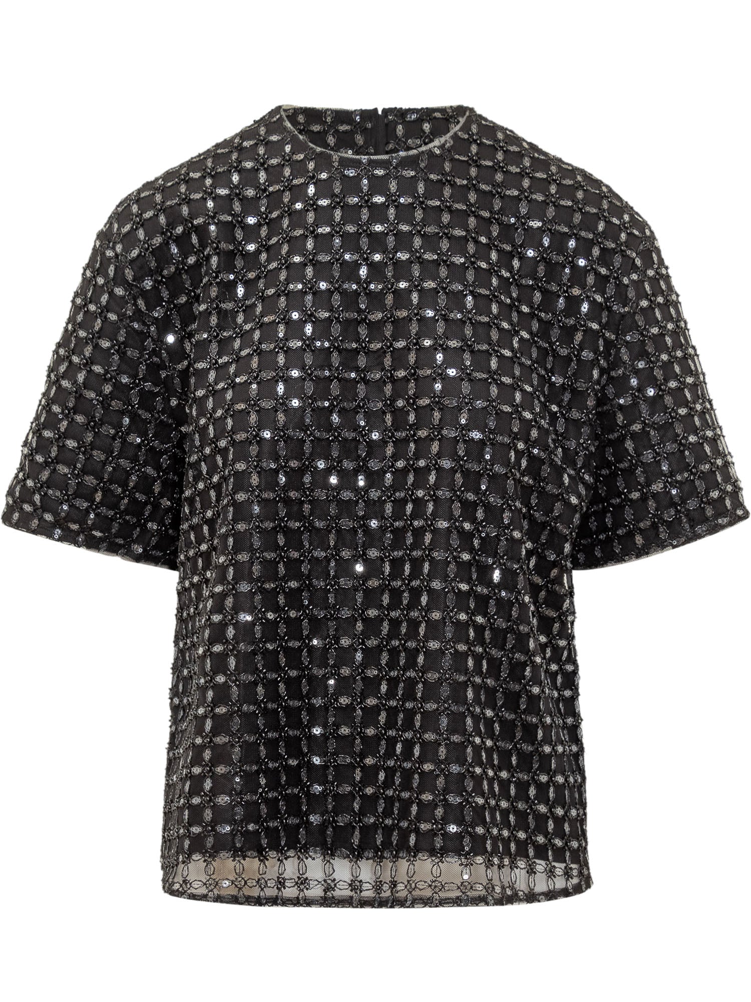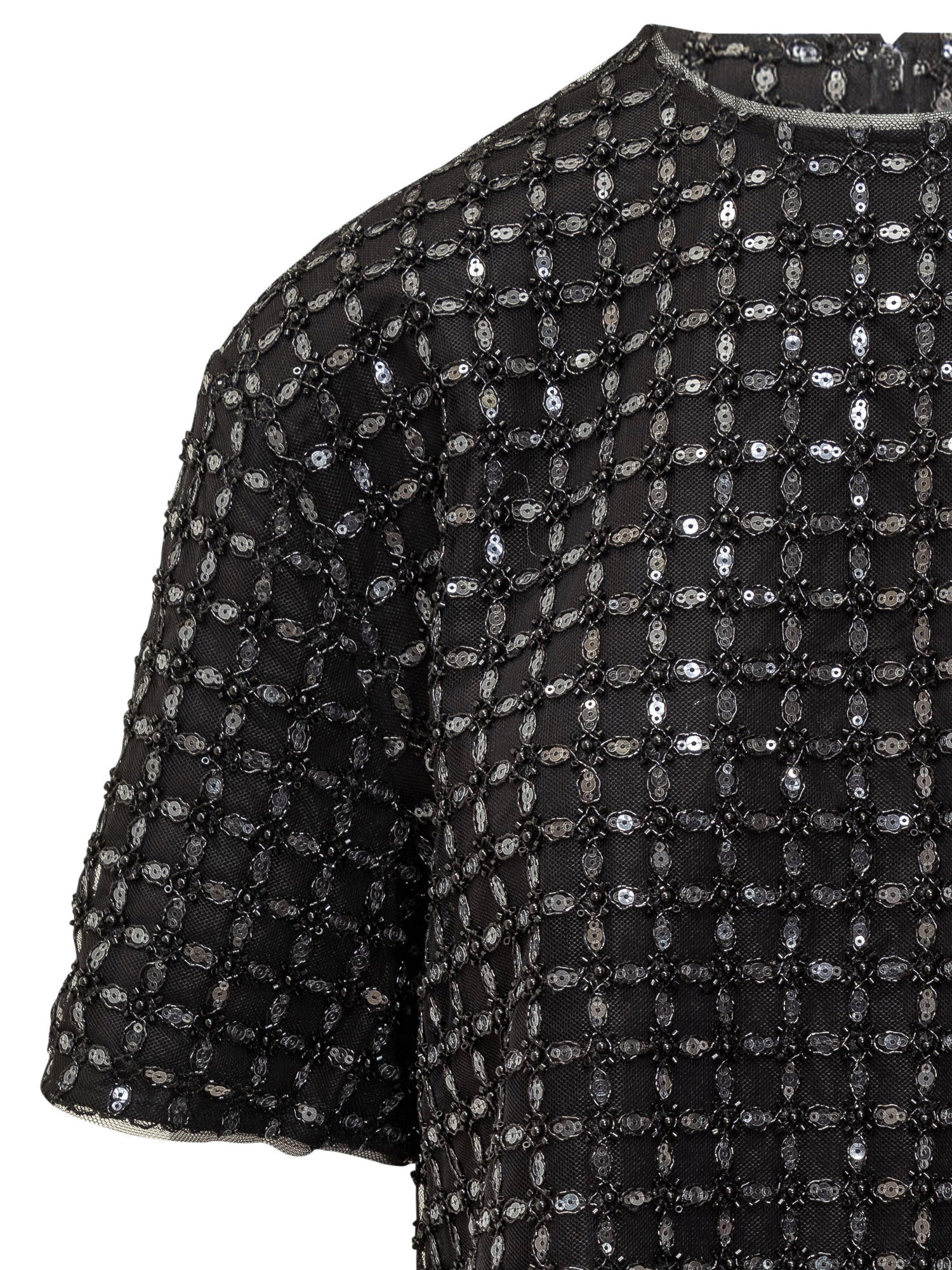 Oversized top embellished with beads and sequins arranged in a bright geometric pattern. Its relaxed silhouette delivers comfort and a modern edge.