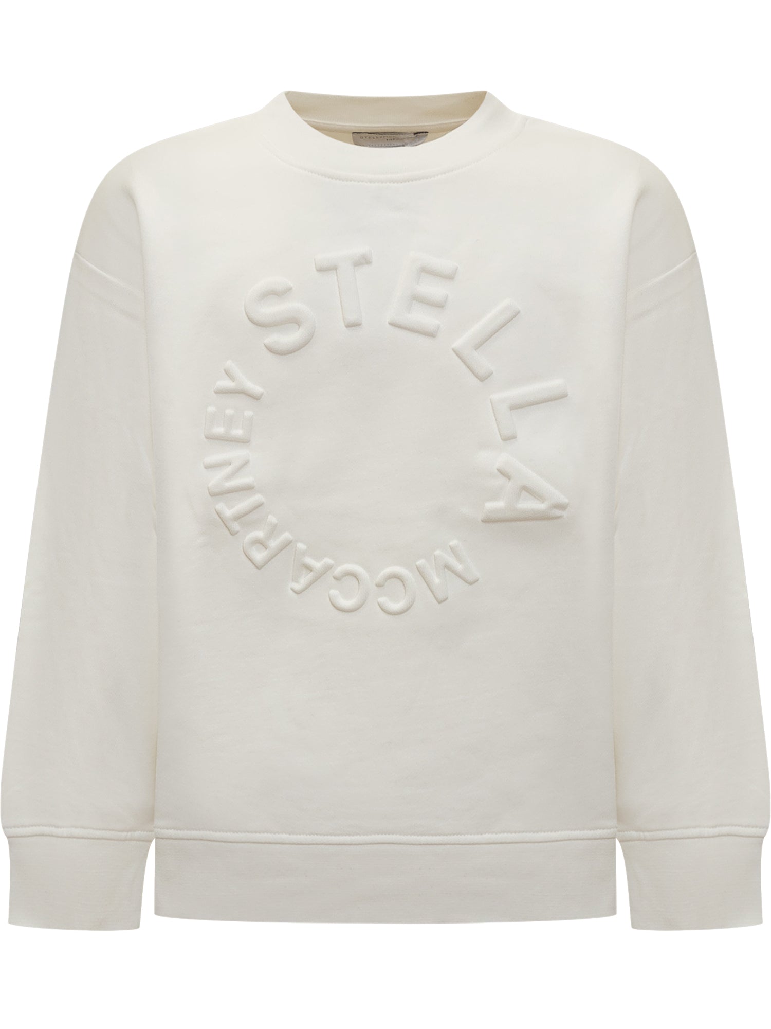 White kids' sweatshirt with tonal embossed Stella McCartney logo on the front. Crew neck, long sleeves, and ribbed trims for a clean, comfy look.