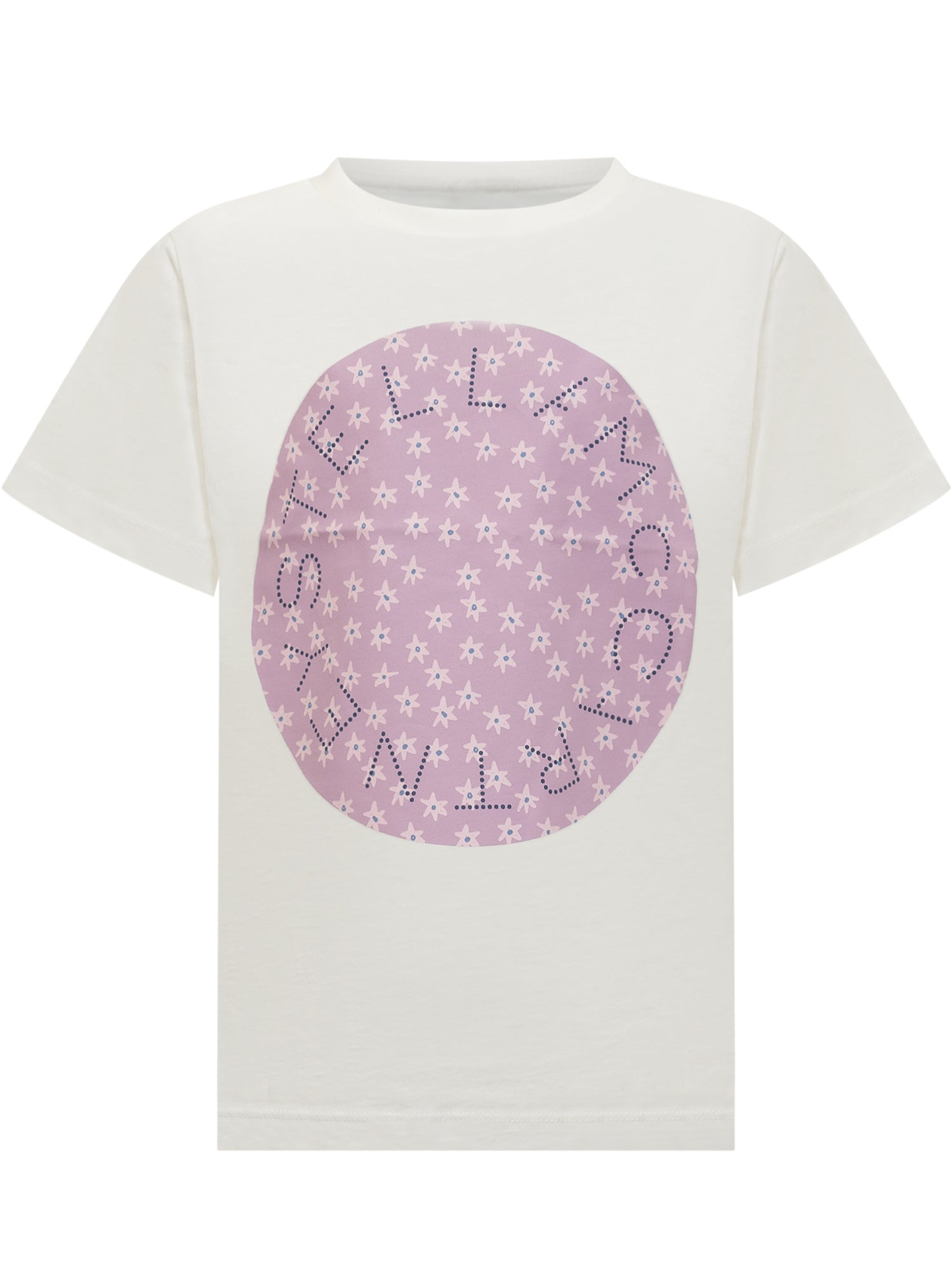 White T-shirt for girls by Stella McCartney Kids, featuring a large lilac circular print with white stars and the brand's dotted logo.
