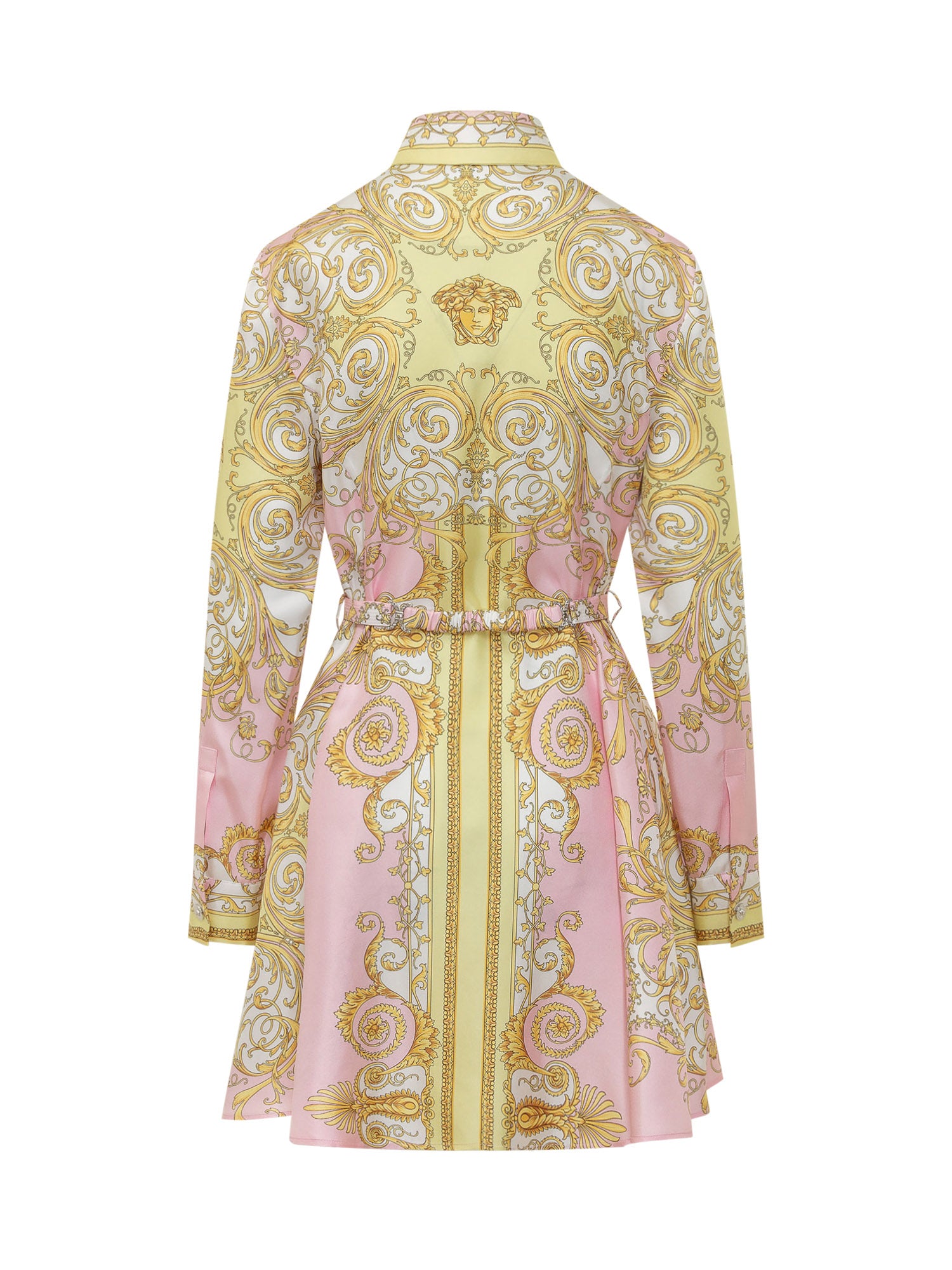Silk twill dress featuring an all-over baroque print, designed with a flared silhouette and long sleeves. The structured cut enhances the figure, while the fluid fabric offers elegance and comfort.