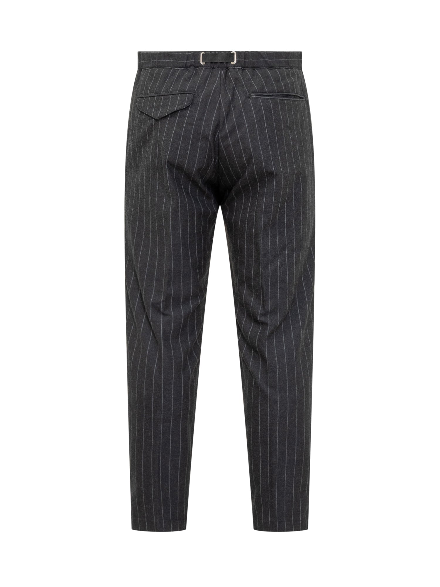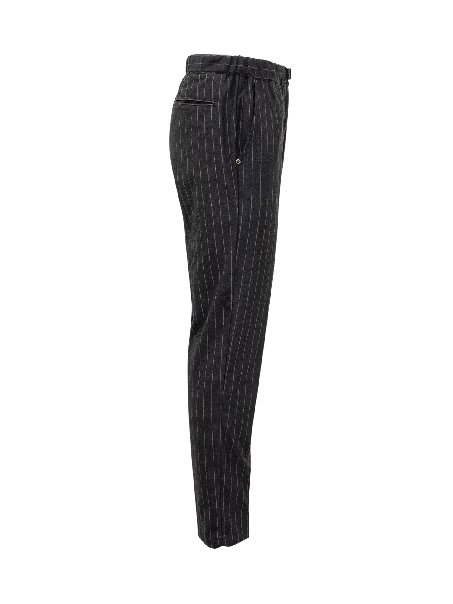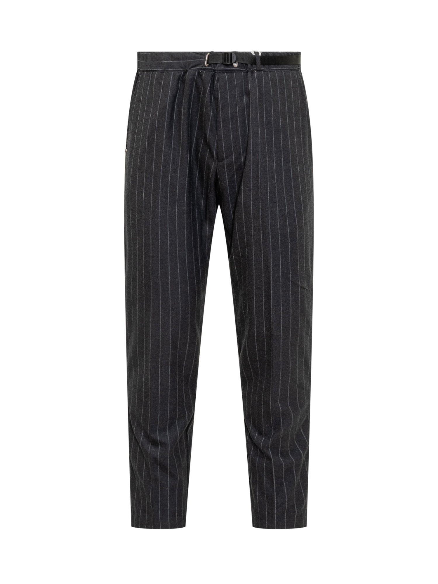 Whitesand black pinstripe trousers with adjustable belt and elastic waist.