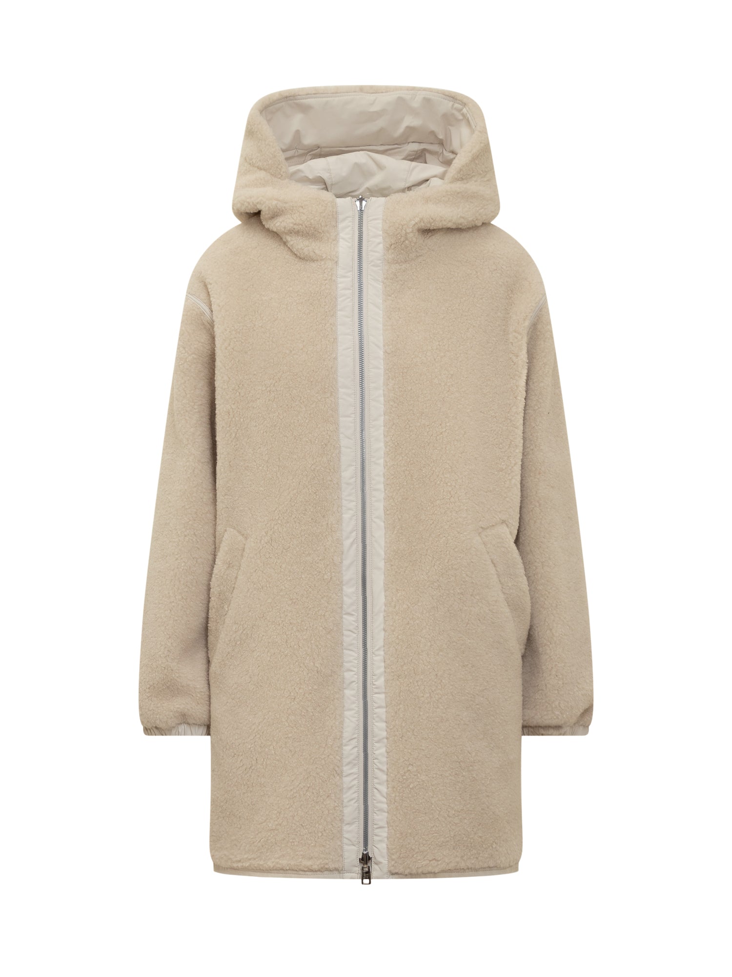 Beige long sleeve teddy down jacket. Hood. Front zip closure. Side pockets. Reversible.