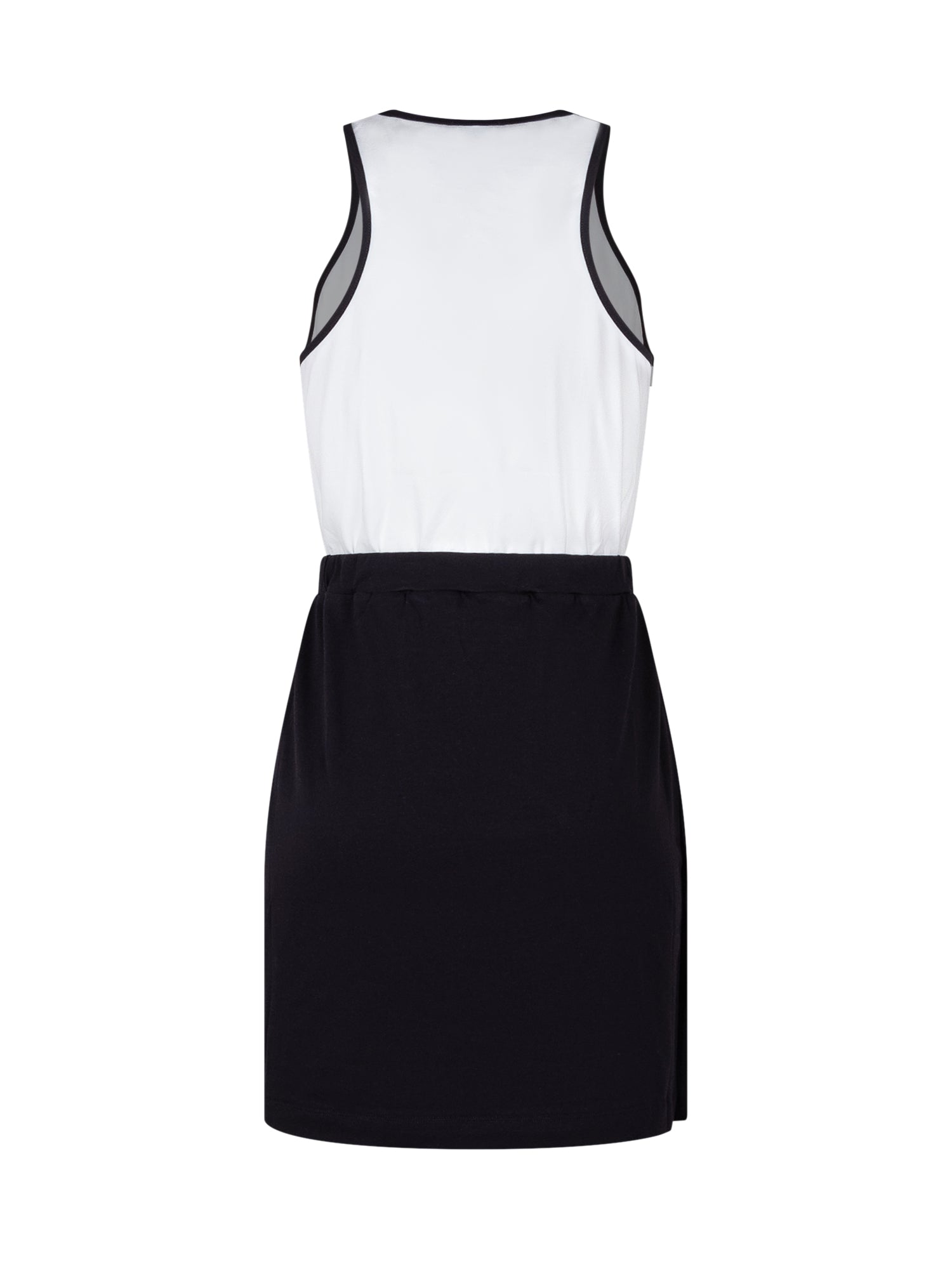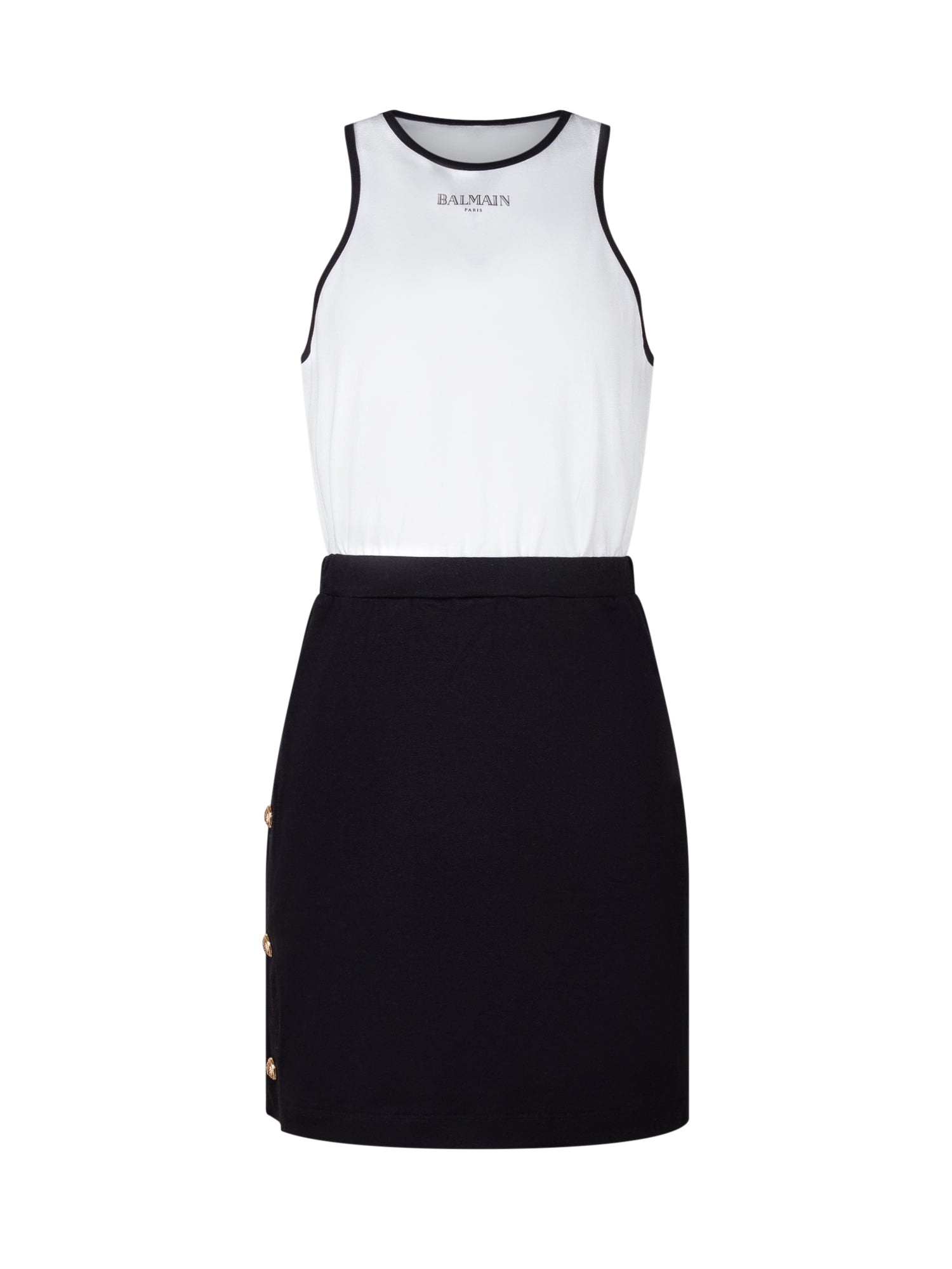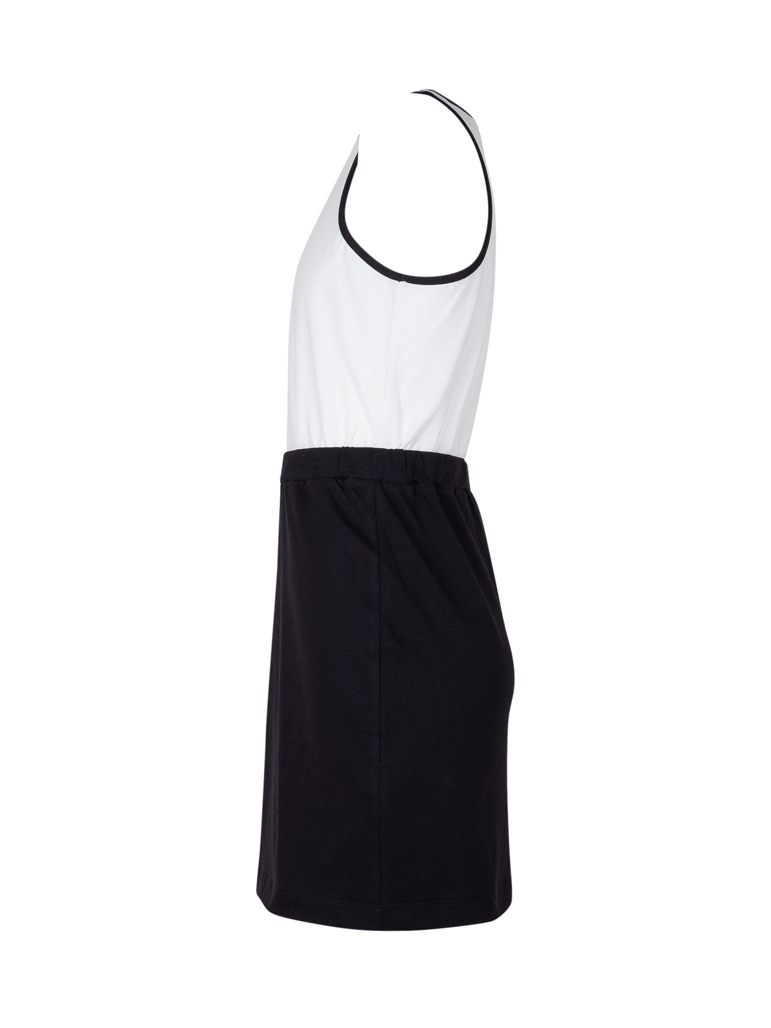 Bicolor jersey dress featuring a contrasting top and fitted skirt. Sleeveless design with a classic crew neck and decorative side buttons. Perfect for an elegant and contemporary look.