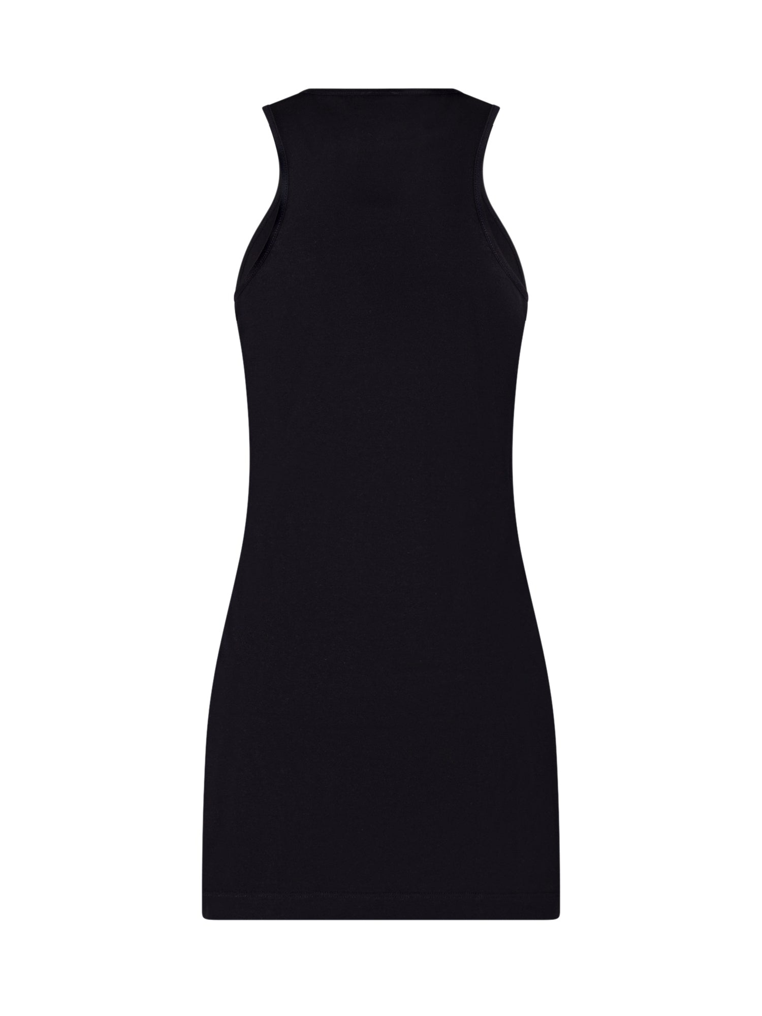 Sleeveless jersey dress featuring a fitted silhouette and classic crew neck. Minimal design enhanced by a contrasting logo print on the front. Perfect for a casual look with a bold attitude.