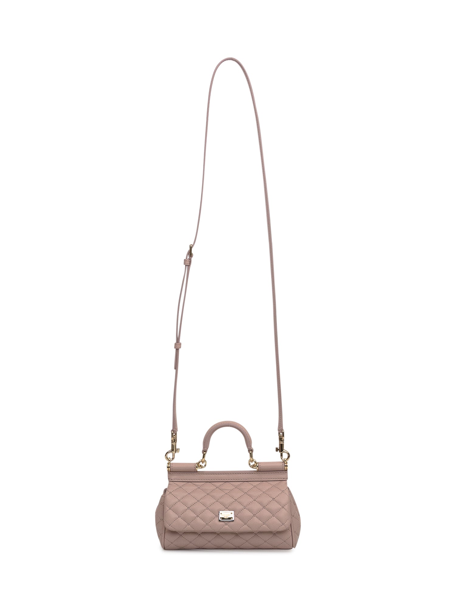Pink handbag in diamond-quilted lambskin leather. One leather handle. Adjustable and removable shoulder strap. Flap with button closure. Golden logo plaque on front. Single internal compartment with Leo lining. Inside pocket with pressed logo.
