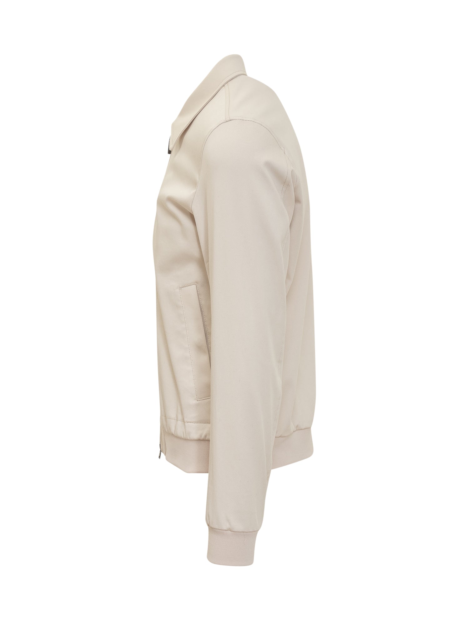 Shirt collar. Zip fastening. Stitched flap pockets. Ribbed knit hem and cuffs.