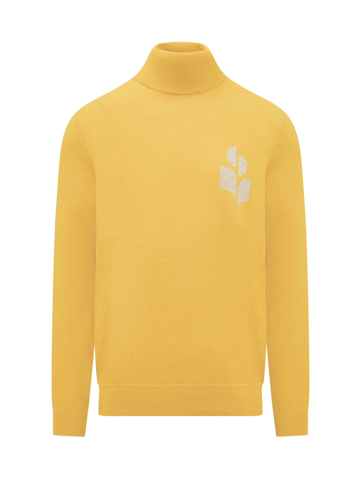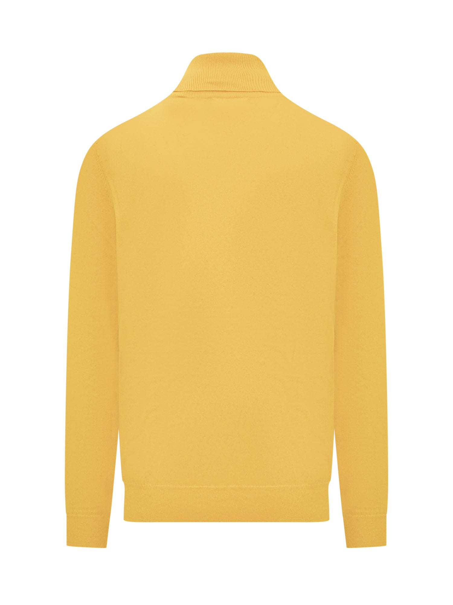Yellow sweater with long sleeves. Turtleneck. Logo on the chest. Ribbed collar, cuffs and bottom.