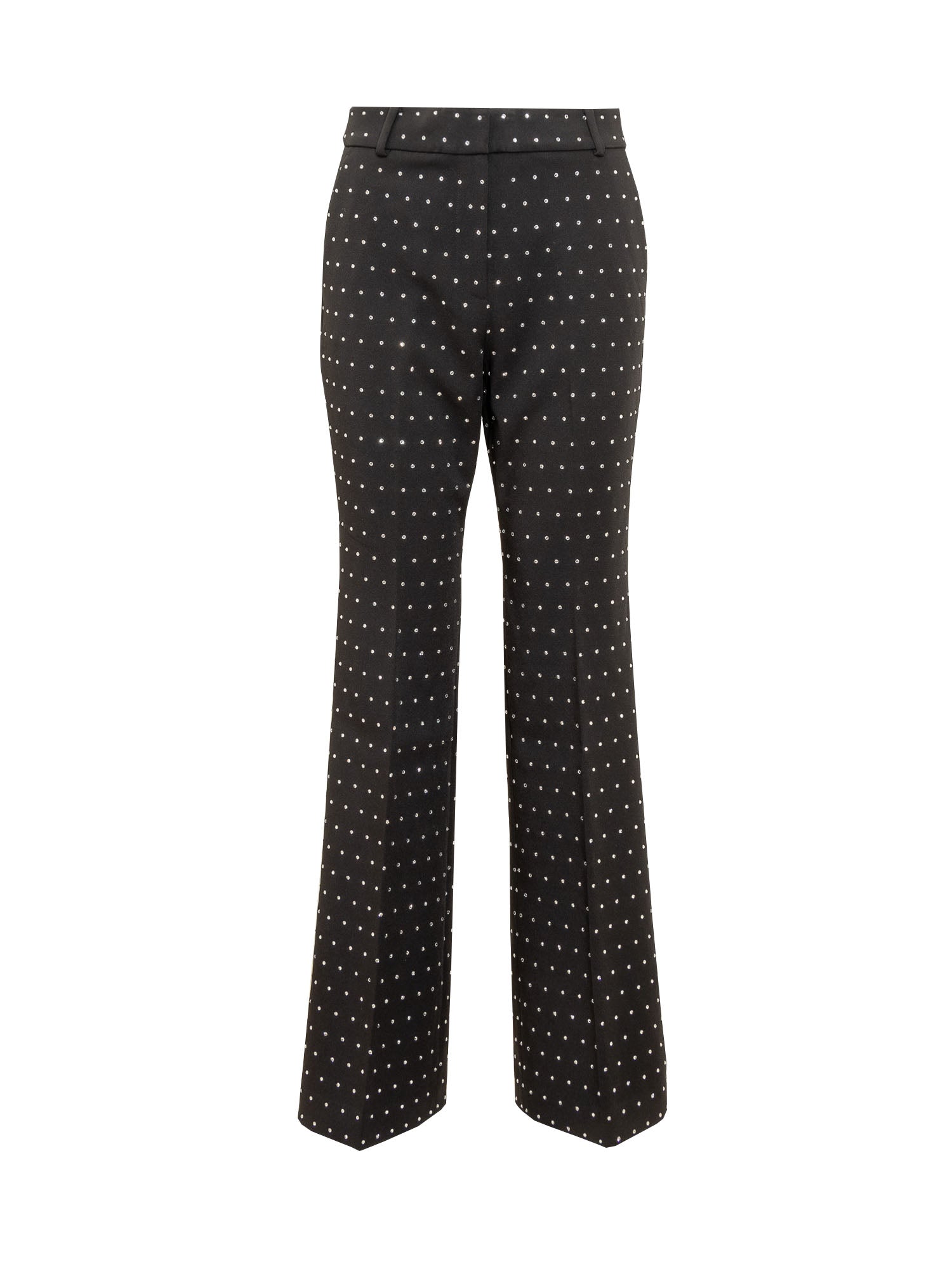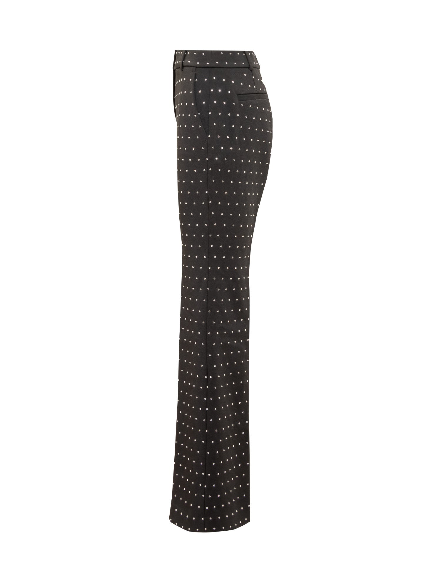 Black long pants. Hook-and-eye and zipper closure. Slit pockets at hips. Welt pockets at back. All-over applique rhinestones.
