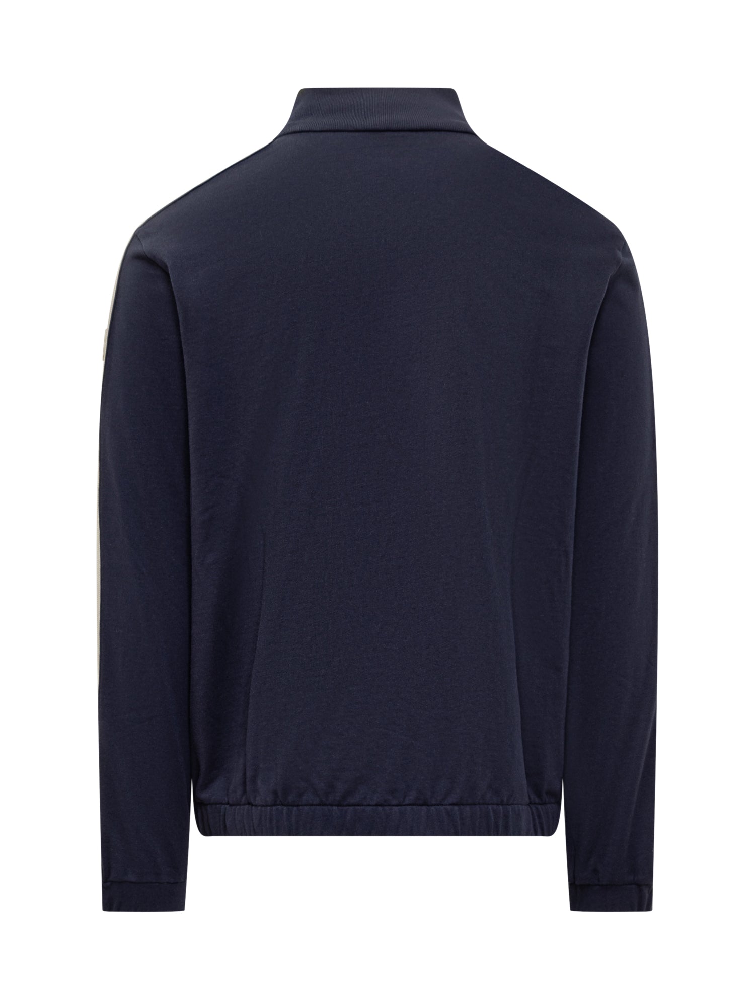 Blue cardigan. Zip fastener. Stitched flap pockets. Contrasting bands on sleeves.