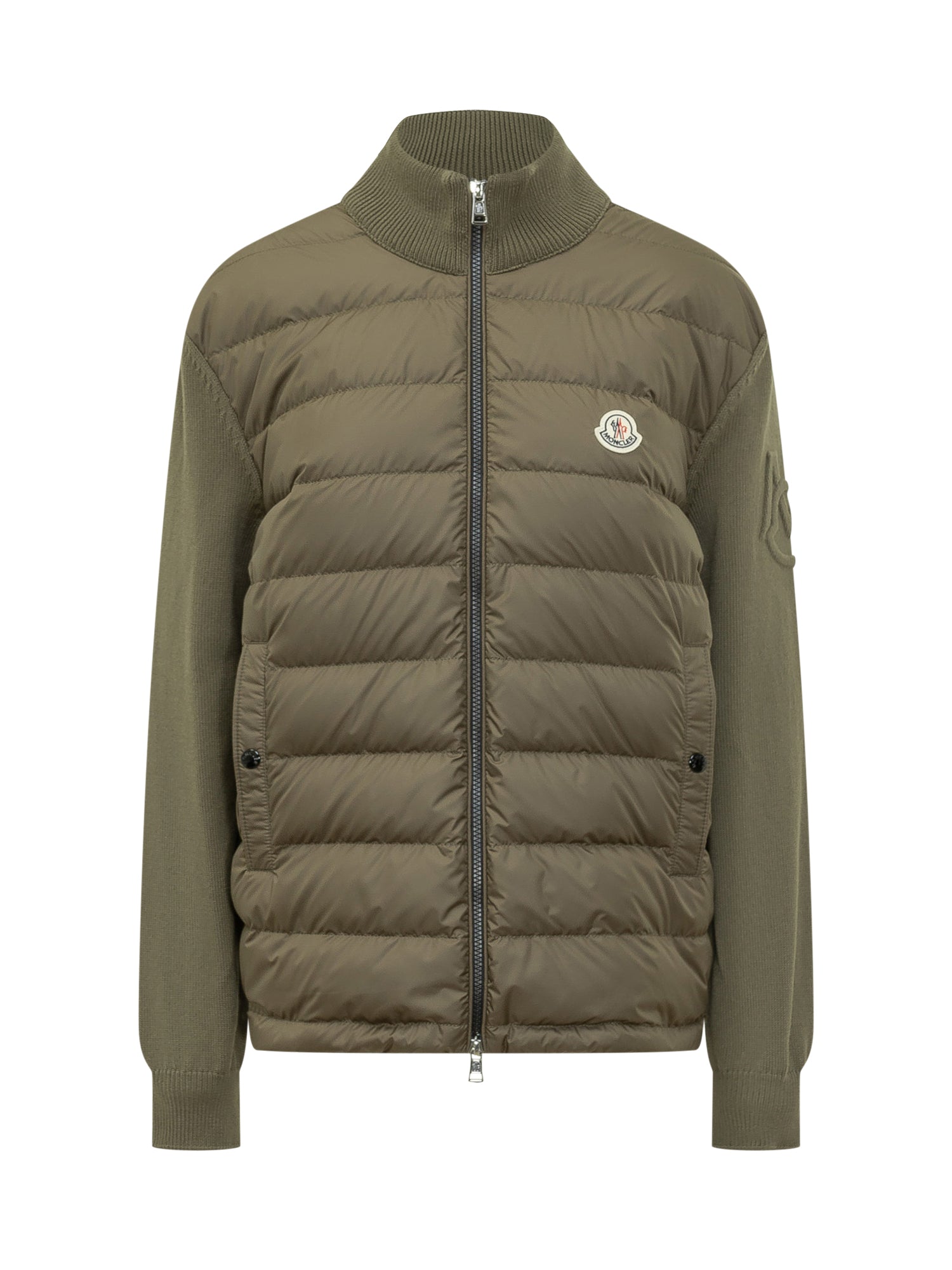 Padded tricot cardigan featuring a quilted nylon front combined with knit sleeves and details. Designed with a high collar, front zip closure and side pockets.
