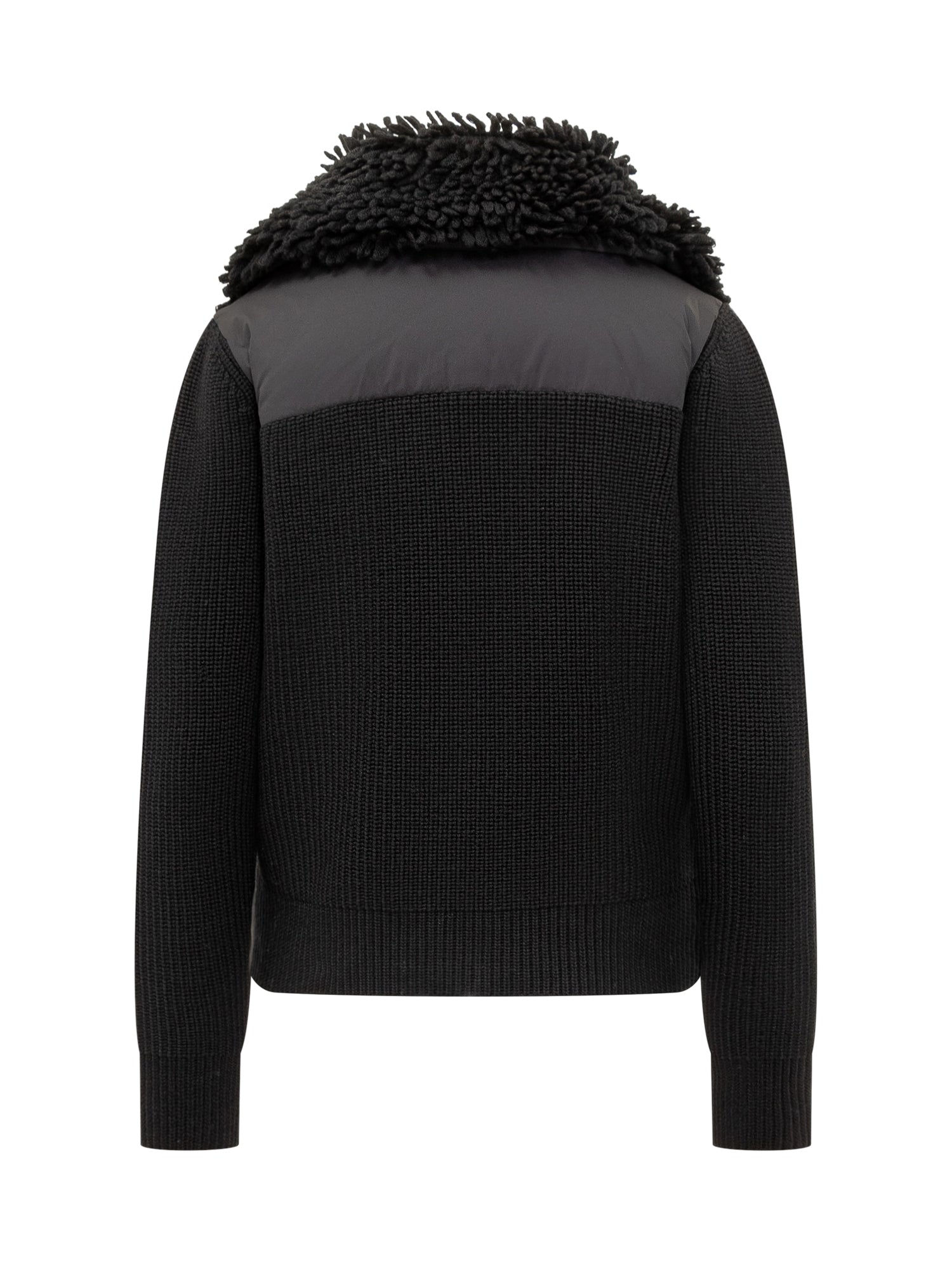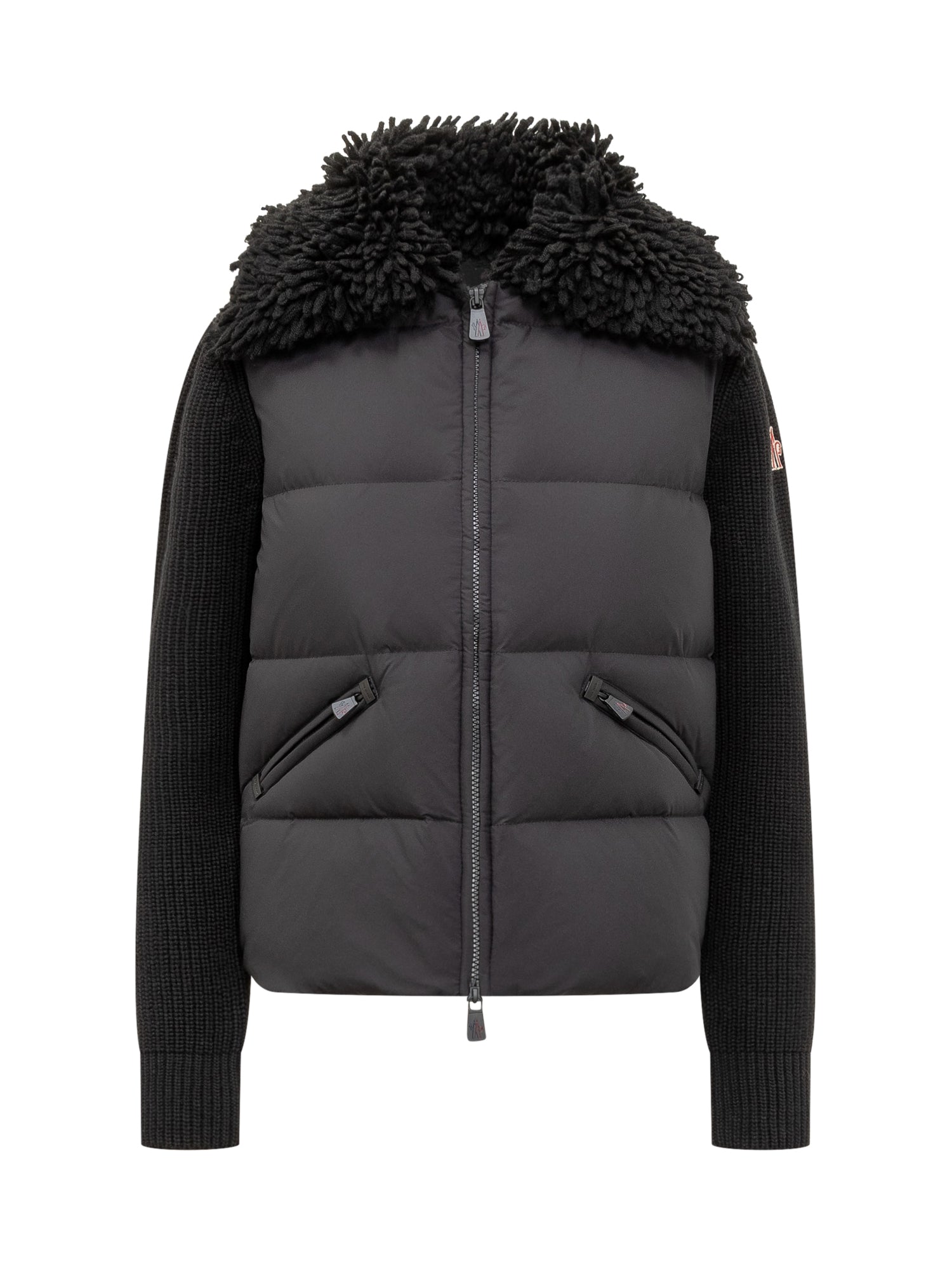 Moncler black padded jacket with zip closure, knitted sleeves and shearling-effect collar.