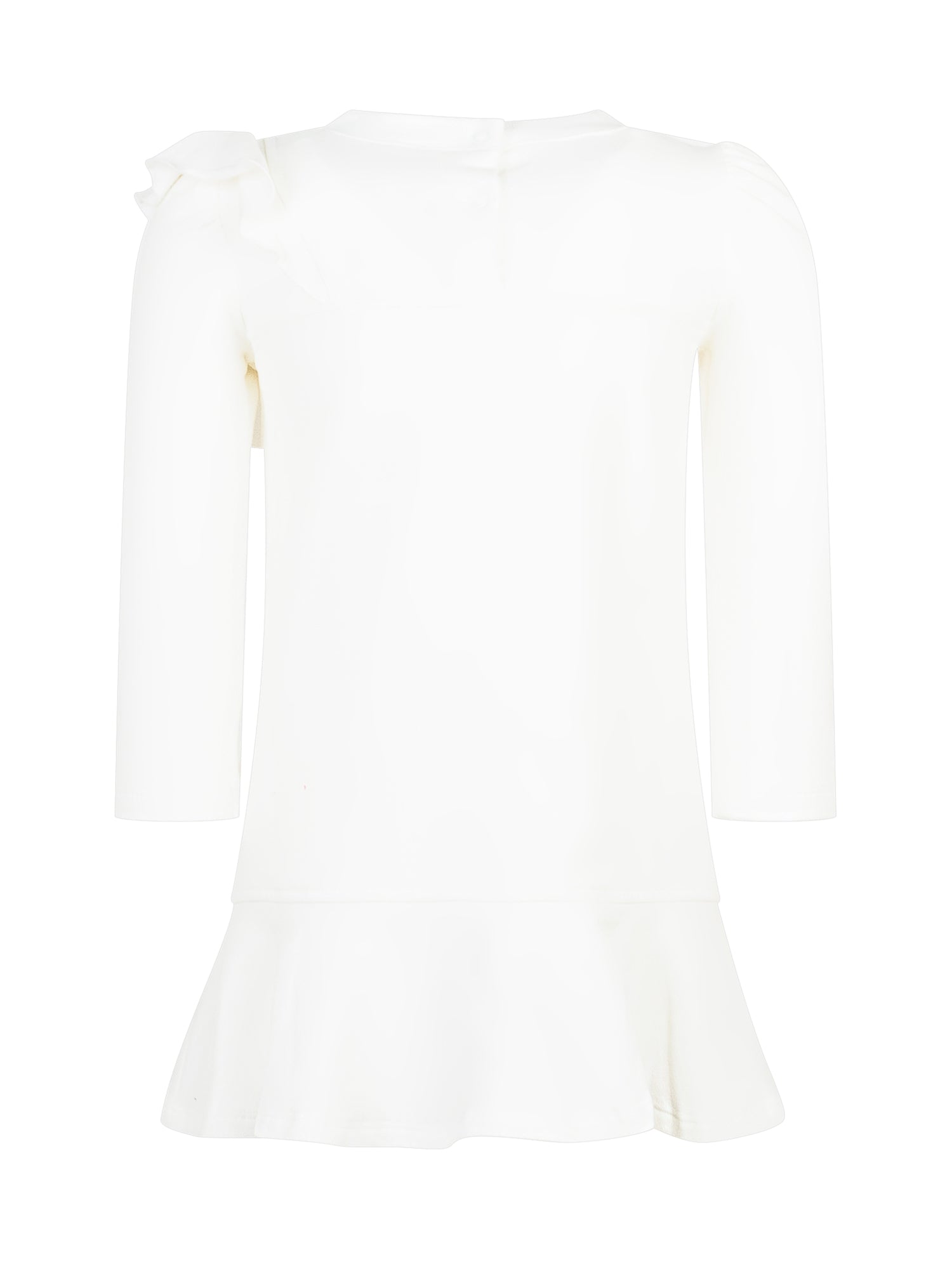 Monnalisa white dress featuring Minnie print, heart details and front ruffle accent.