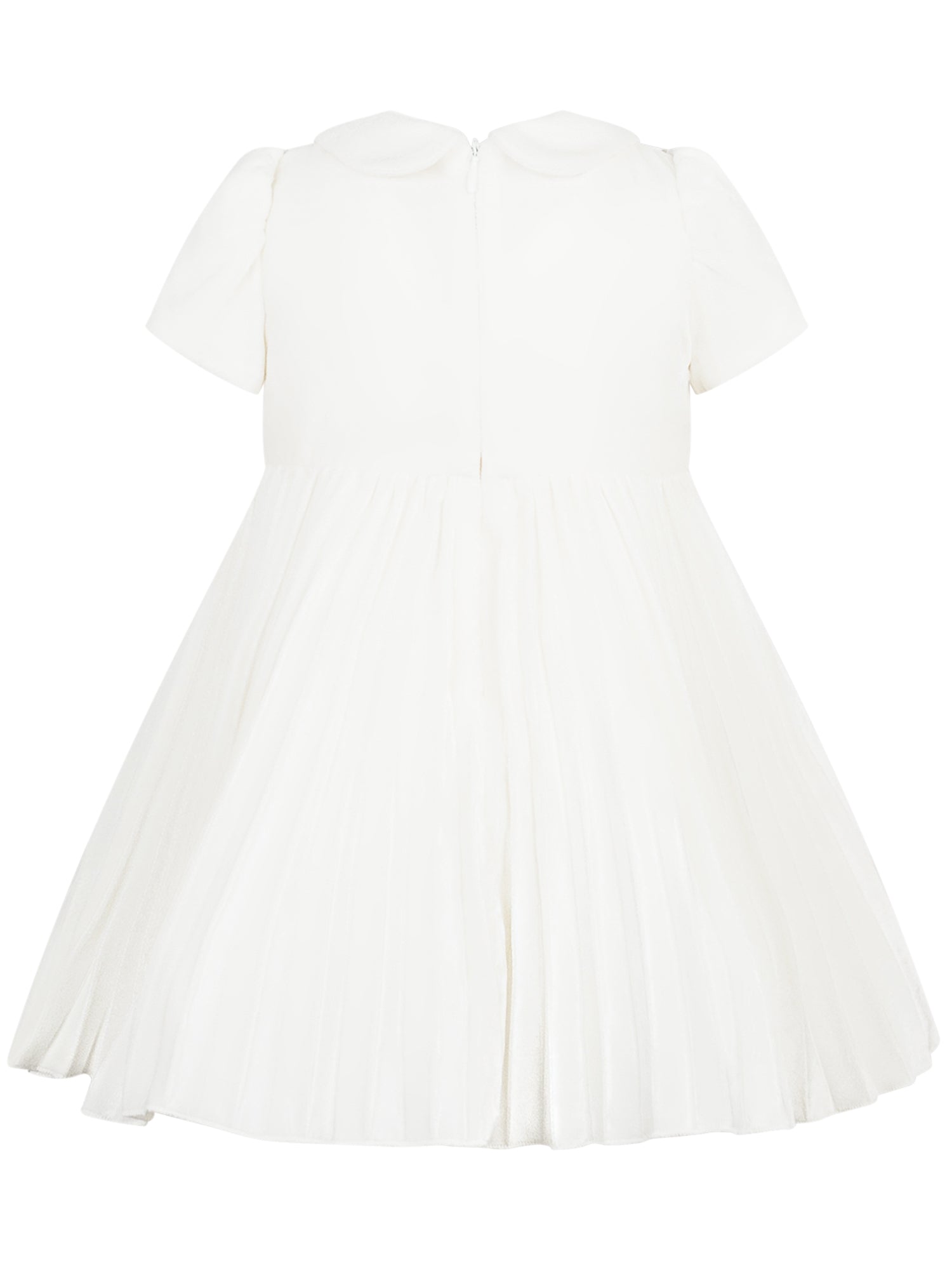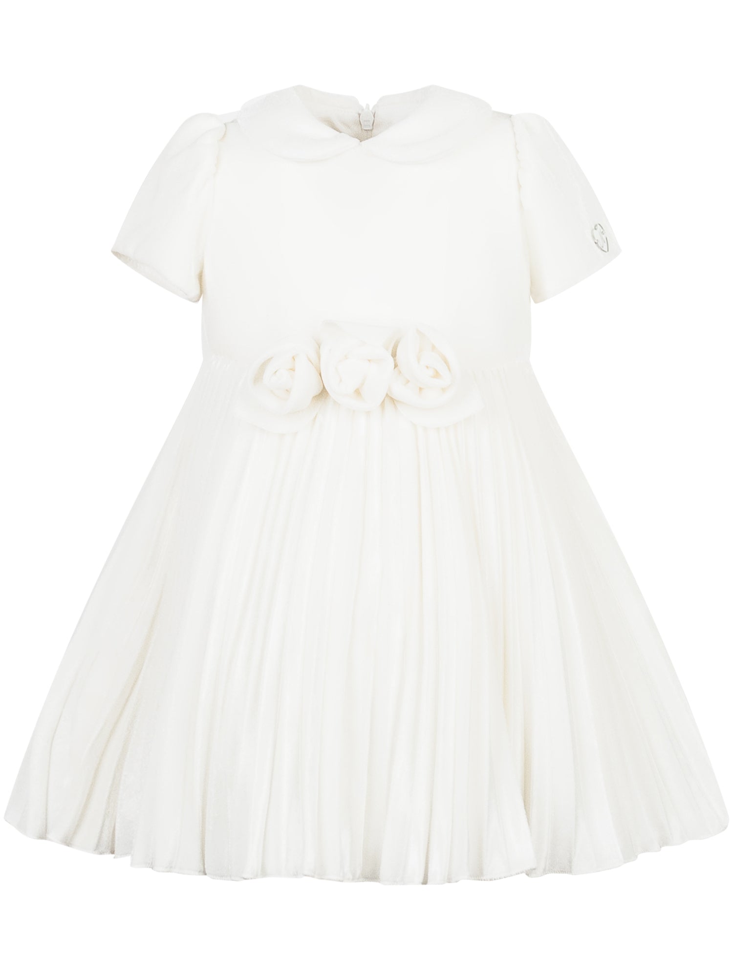 Monnalisa white dress featuring short sleeves, round collar and rose details at the waist. The pleated skirt adds elegance and charm.