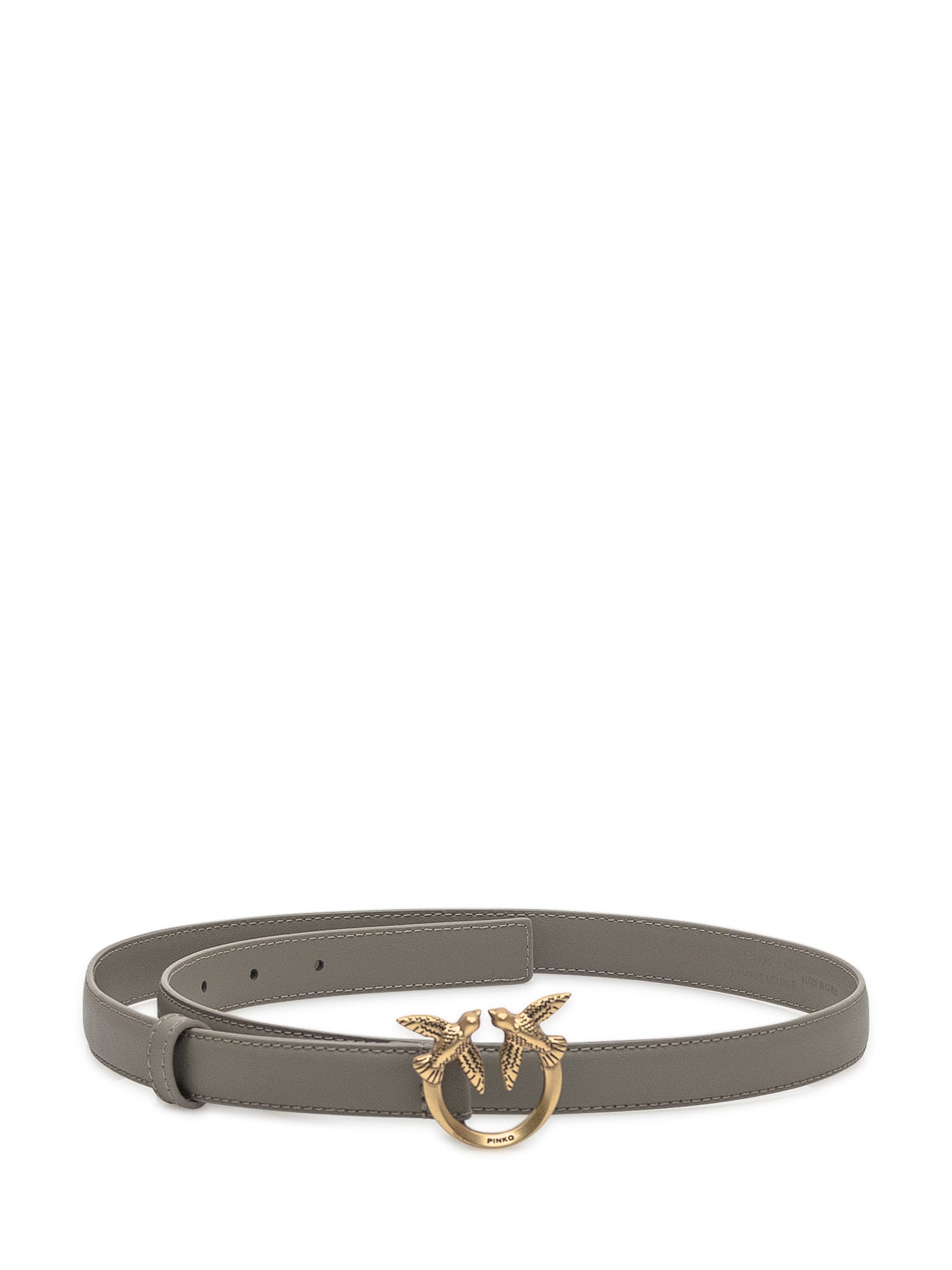 Grey leather Pinko belt with signature gold Love Birds buckle.
