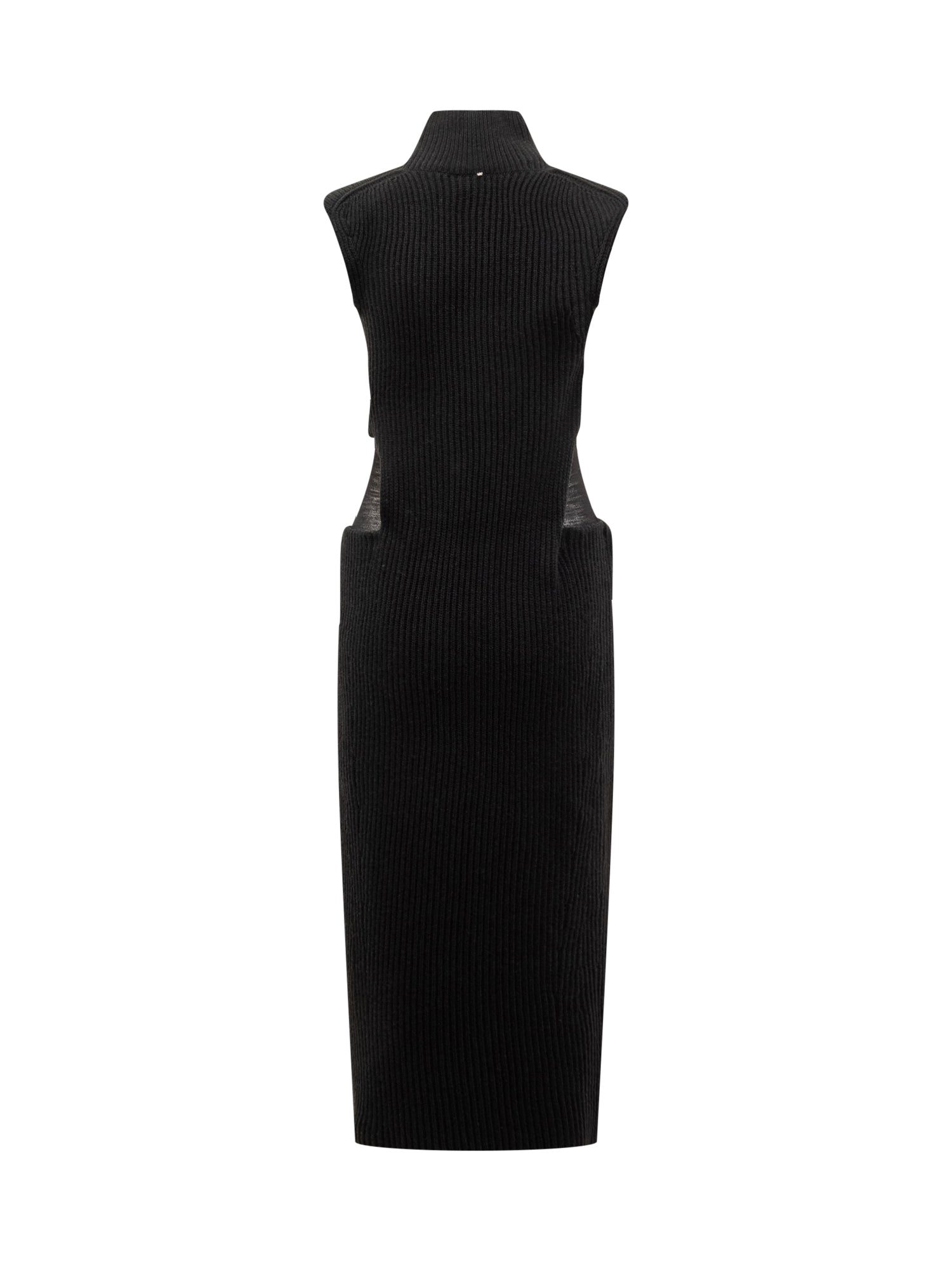 Black wool suit. Sleeveless body with transparent effect. Long sleeved dress with turtleneck. Cut-out at the waist.