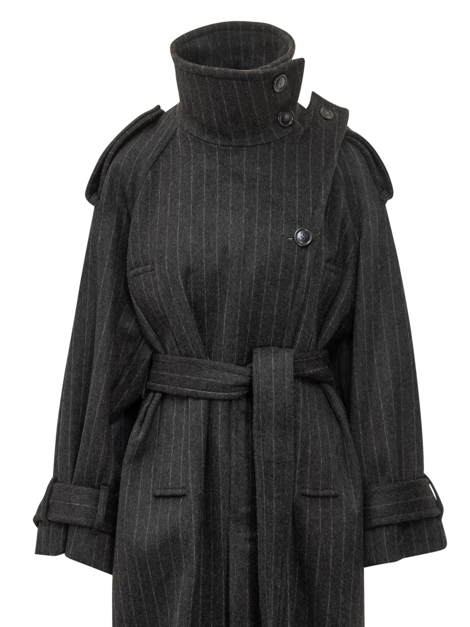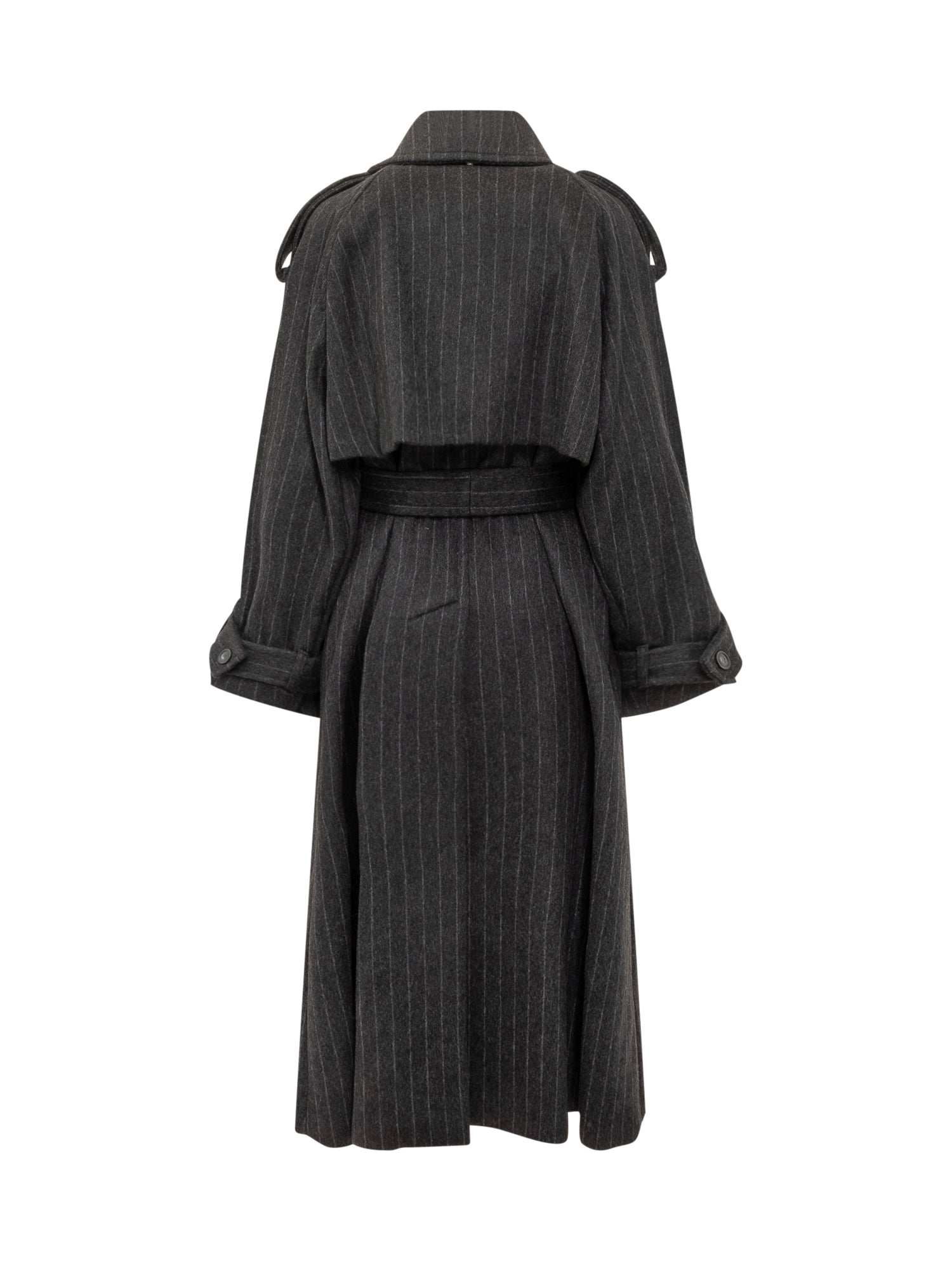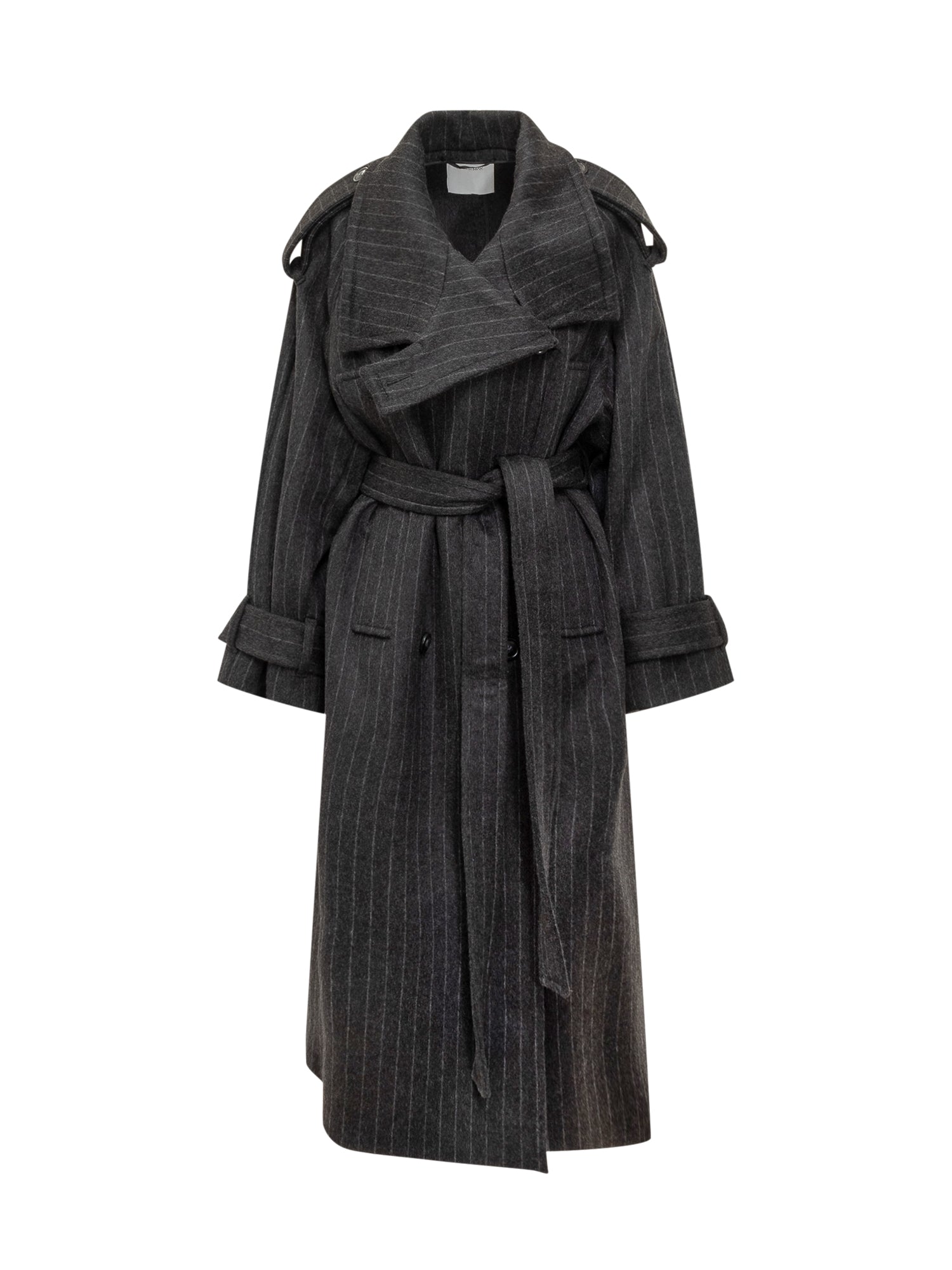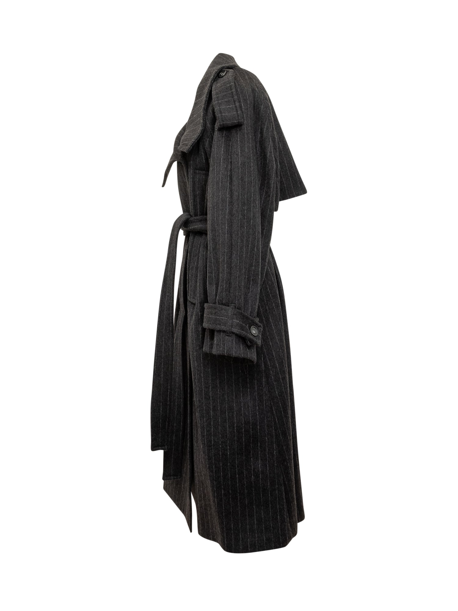 Sportmax long pinstripe wool coat with belted waist and double-breasted closure. Features wide collar, structured shoulders, and flap details.