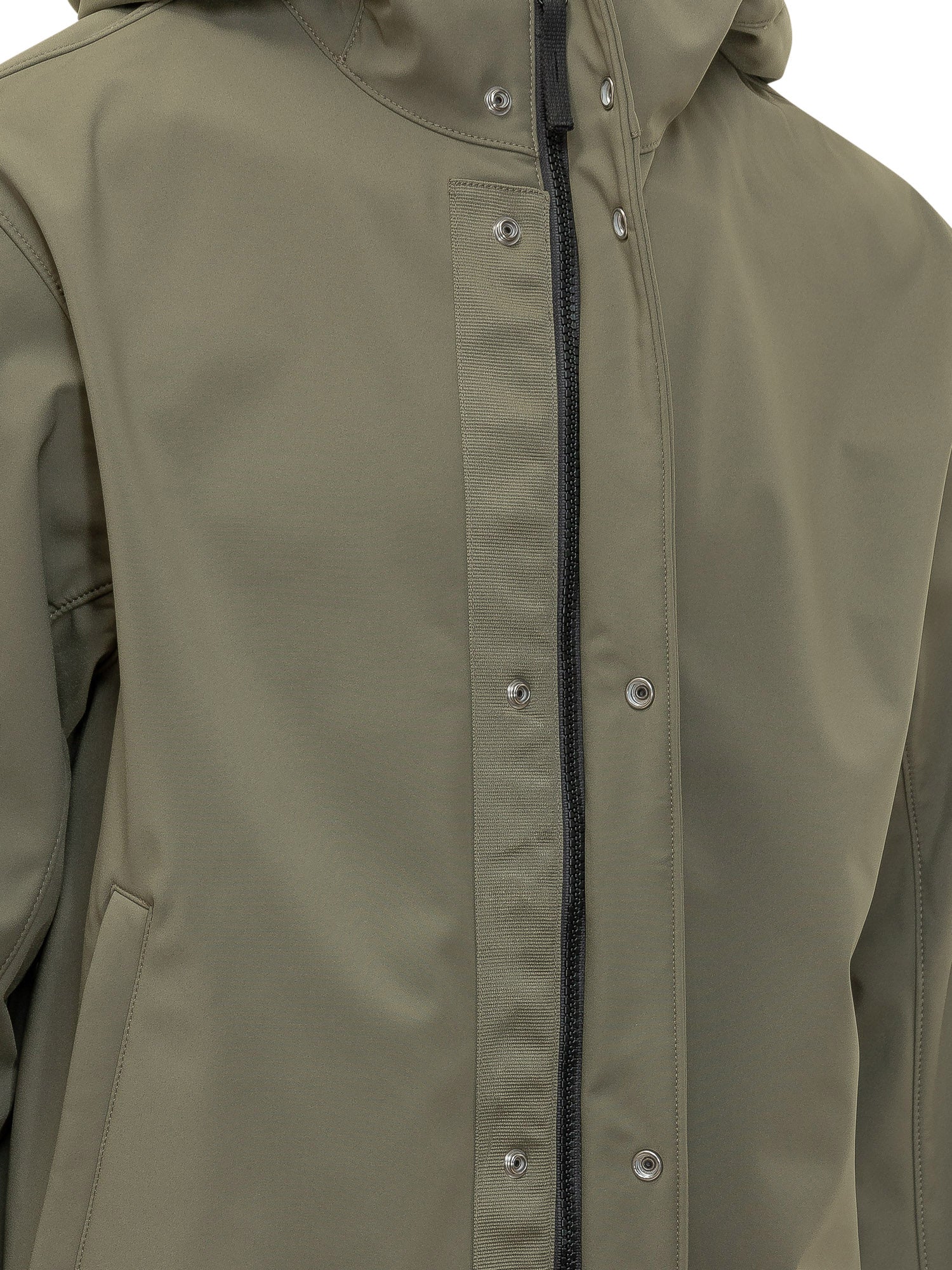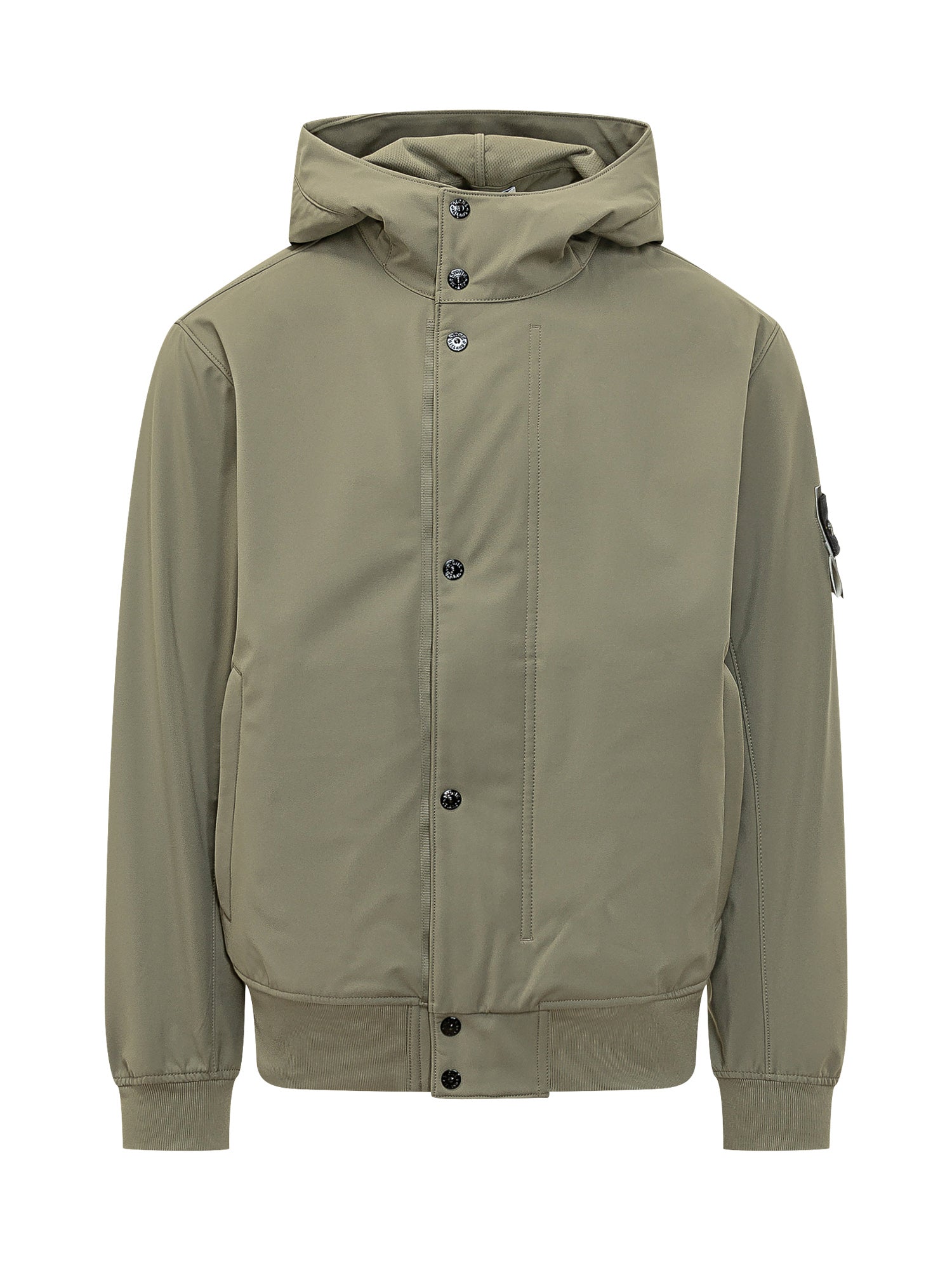 Regular-fit jacket with an integrated hood and front button closure. The clean design is finished with elasticated cuffs and hem, plus a functional sleeve pocket.