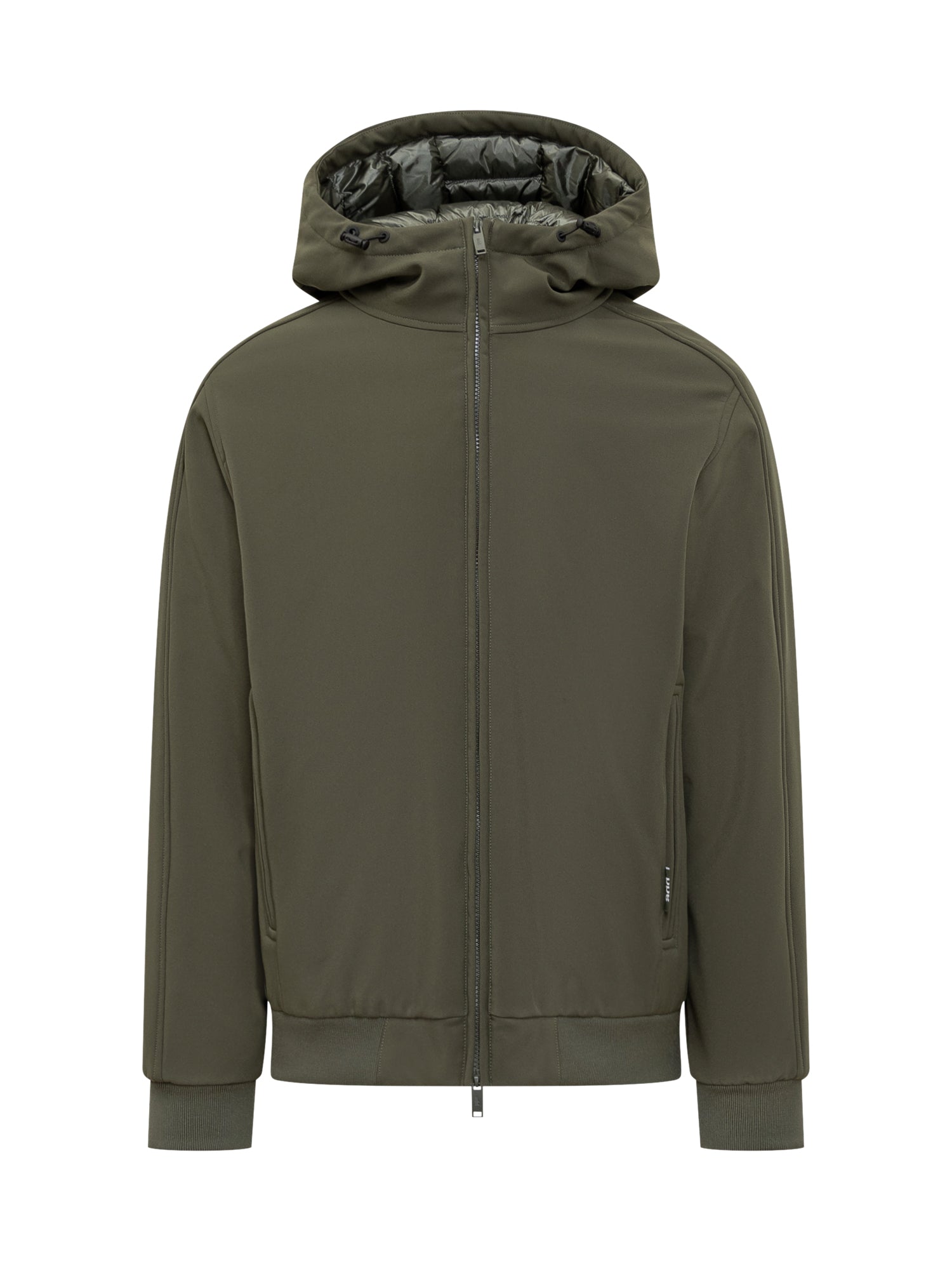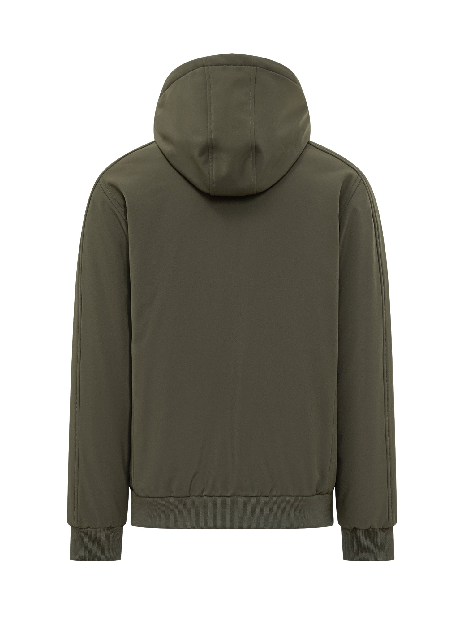Add green jacket with adjustable hood, zip closure, and ribbed cuffs. Made from technical softshell fabric.