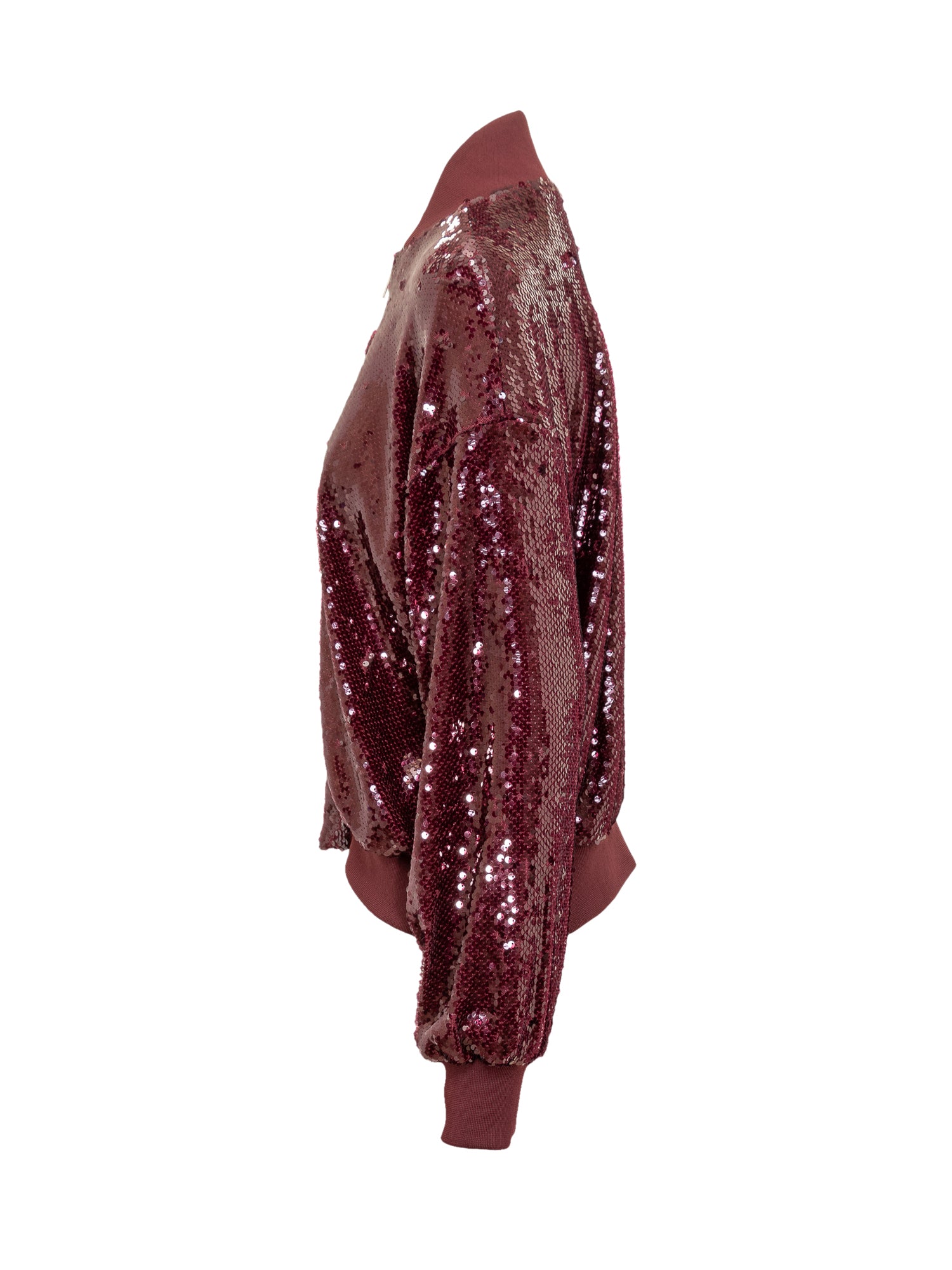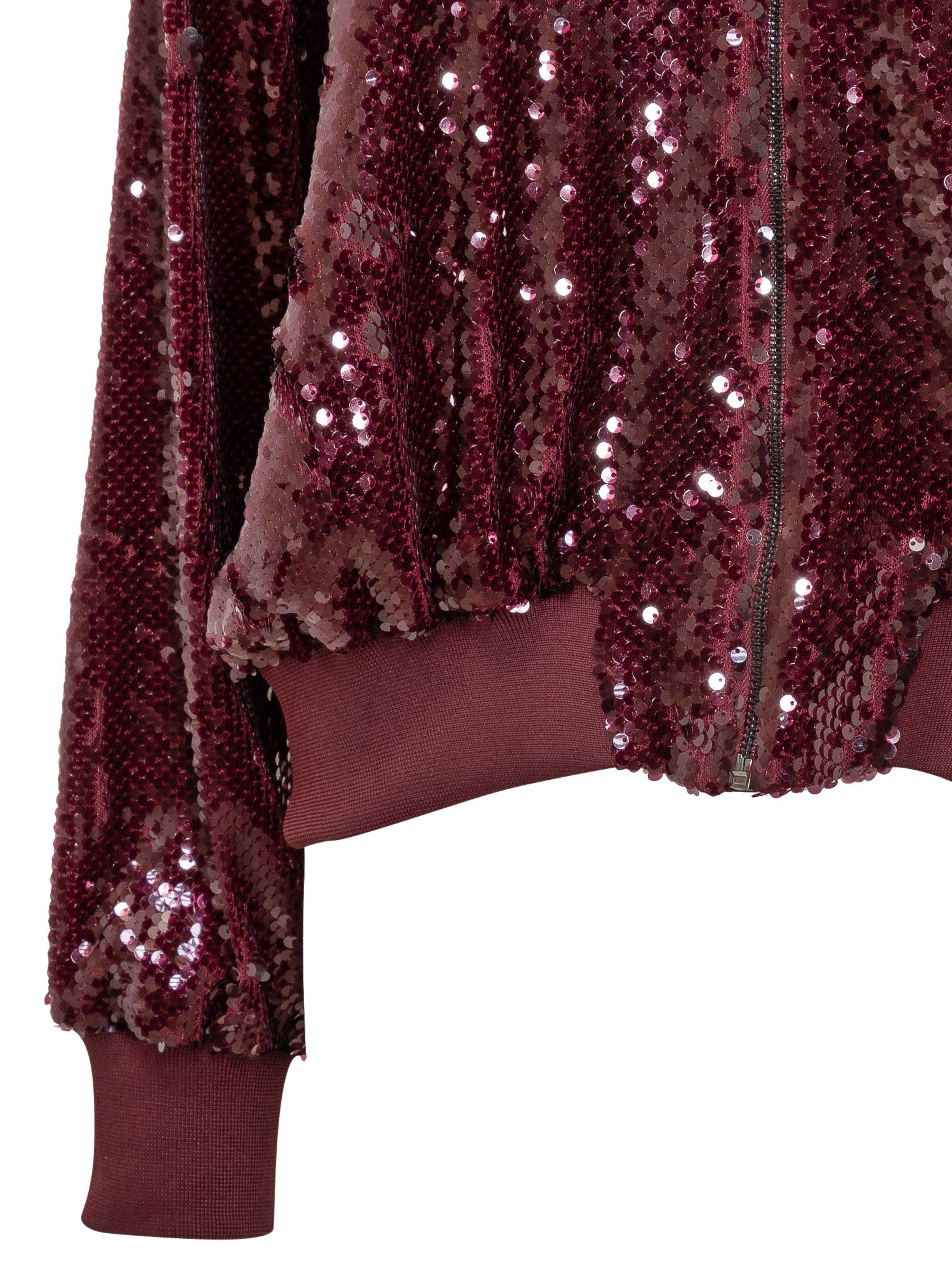 Akep bomber jacket in burgundy fabric embellished with all-over sequins. Ribbed collar and cuffs, front zip closure.