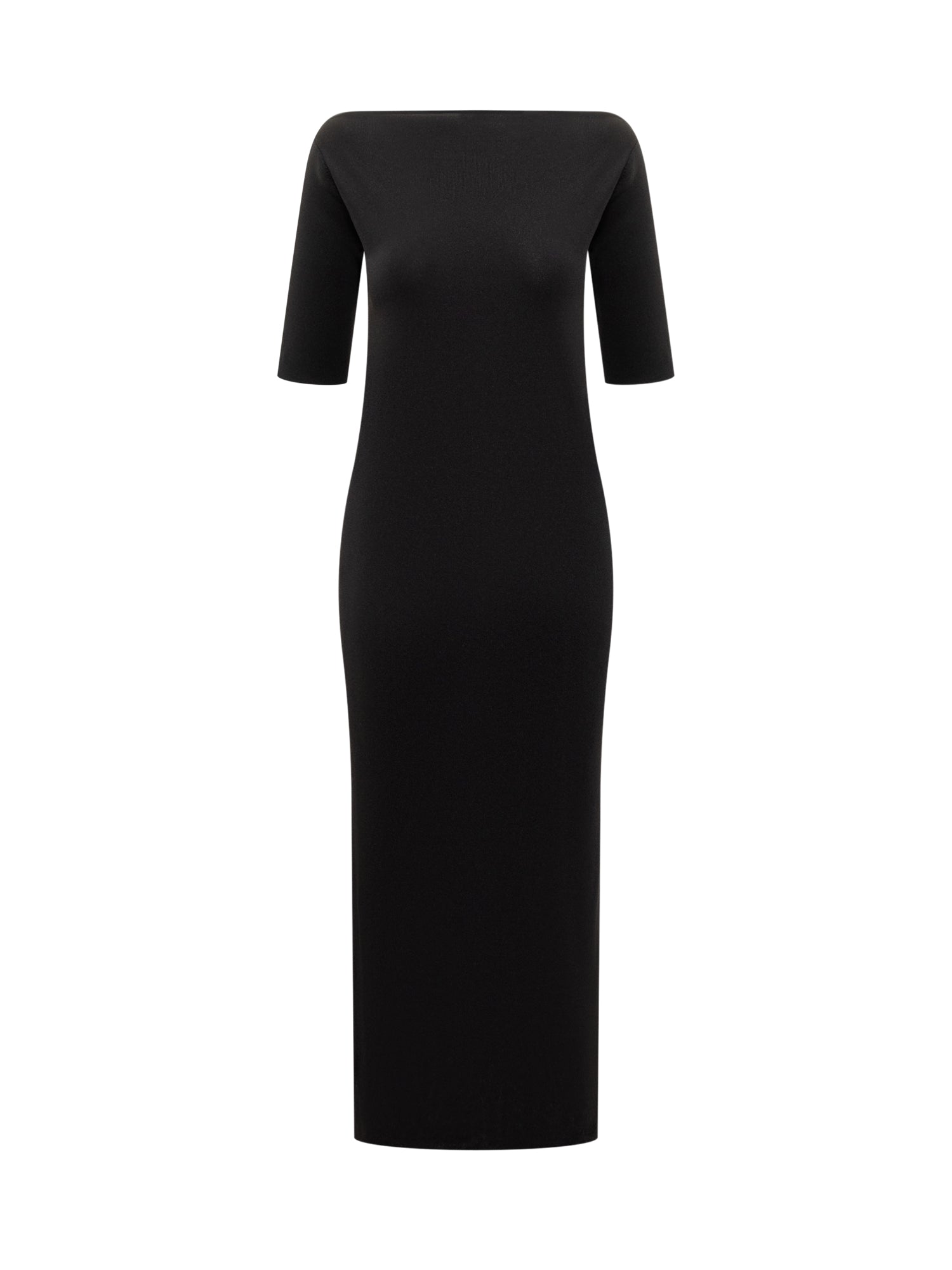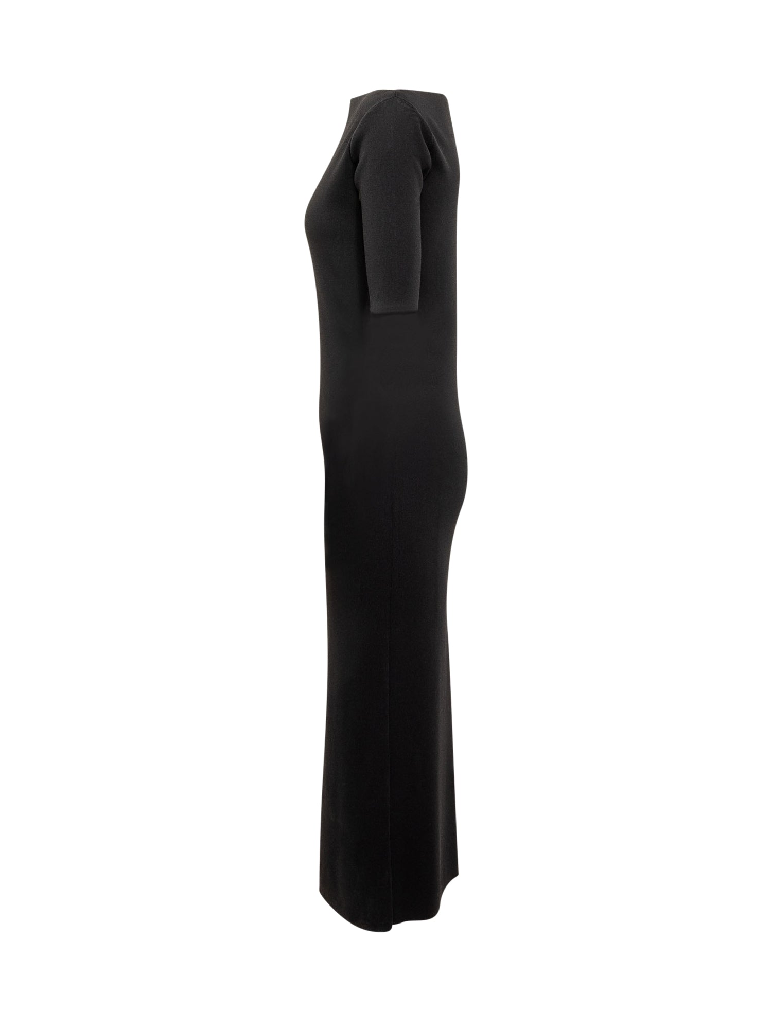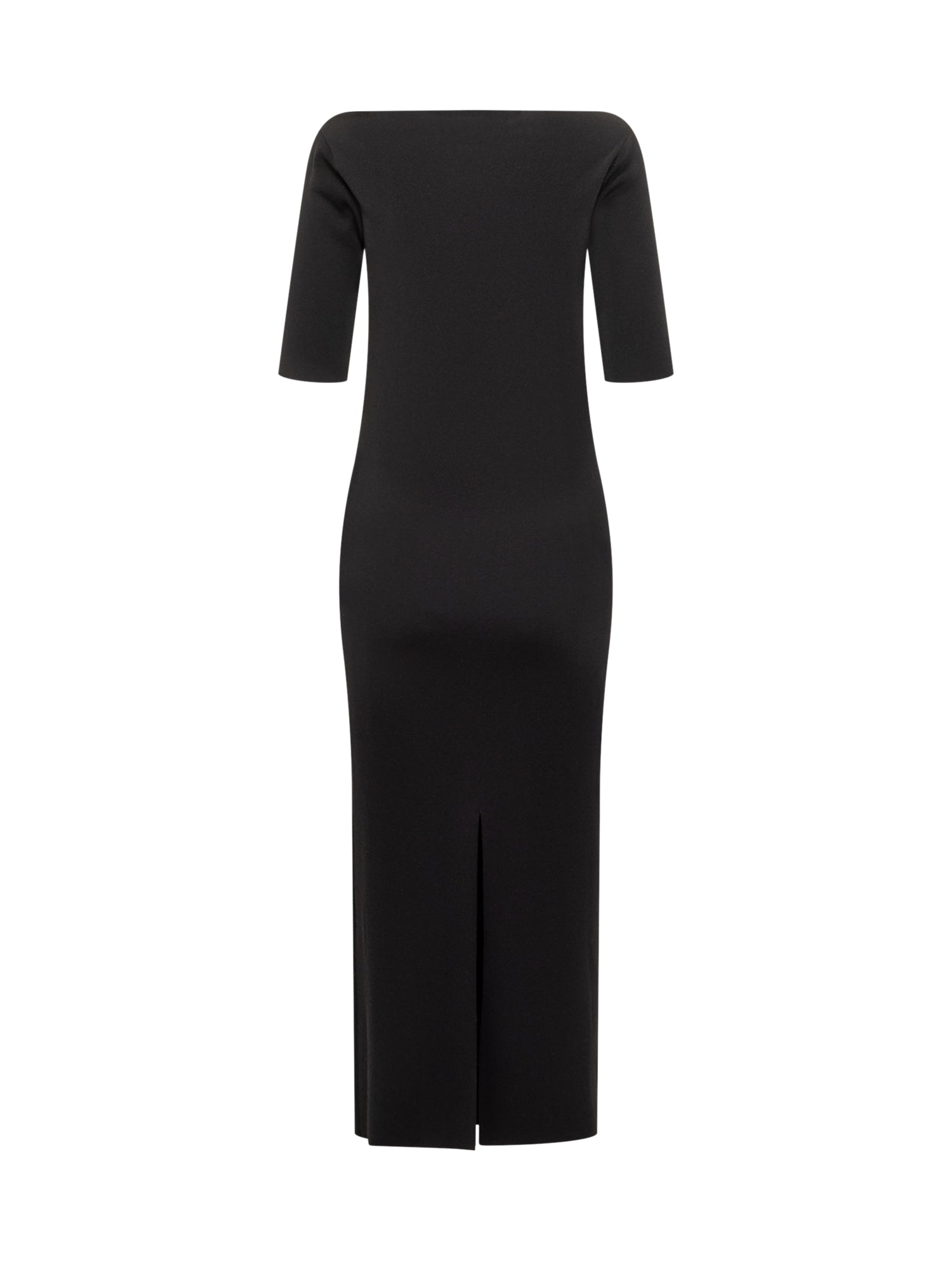 Alpha Studio black lightweight knit dress featuring boat neckline and elbow sleeves. Slim, long silhouette for a refined and minimalist elegance.