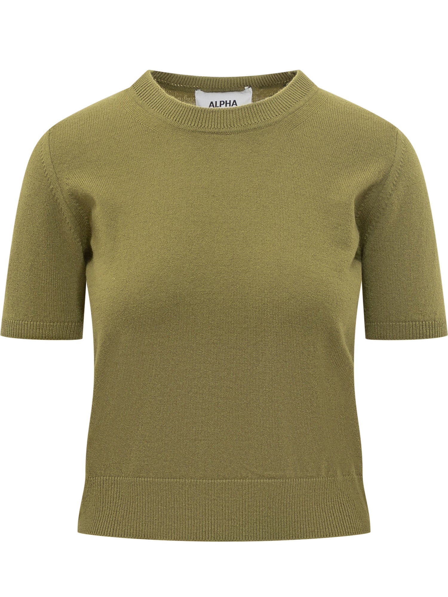 lpha Studio green short-sleeve knit sweater with round neck.