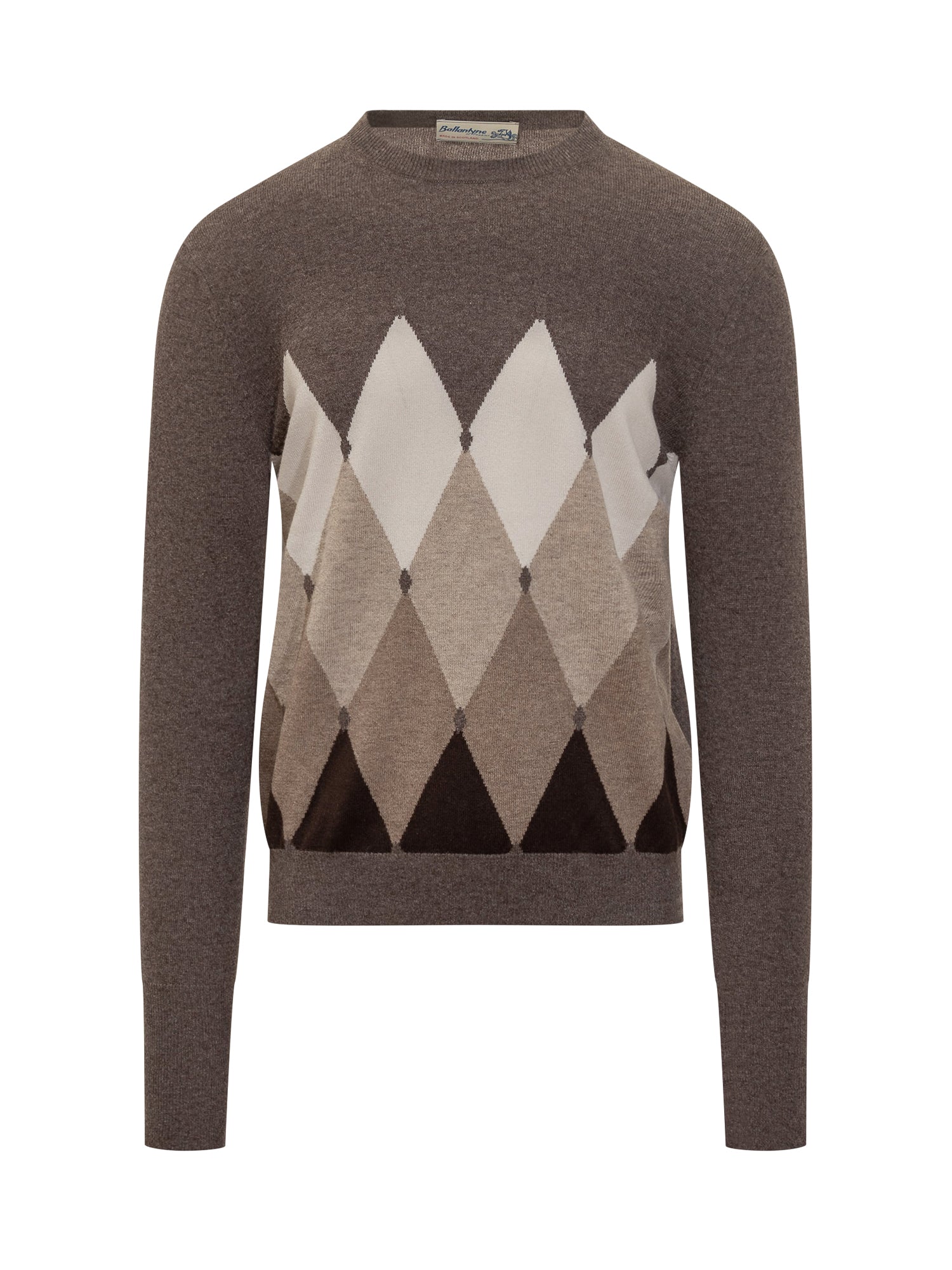 Ballantyne sweater in brown wool with iconic argyle motif in beige and white shades.