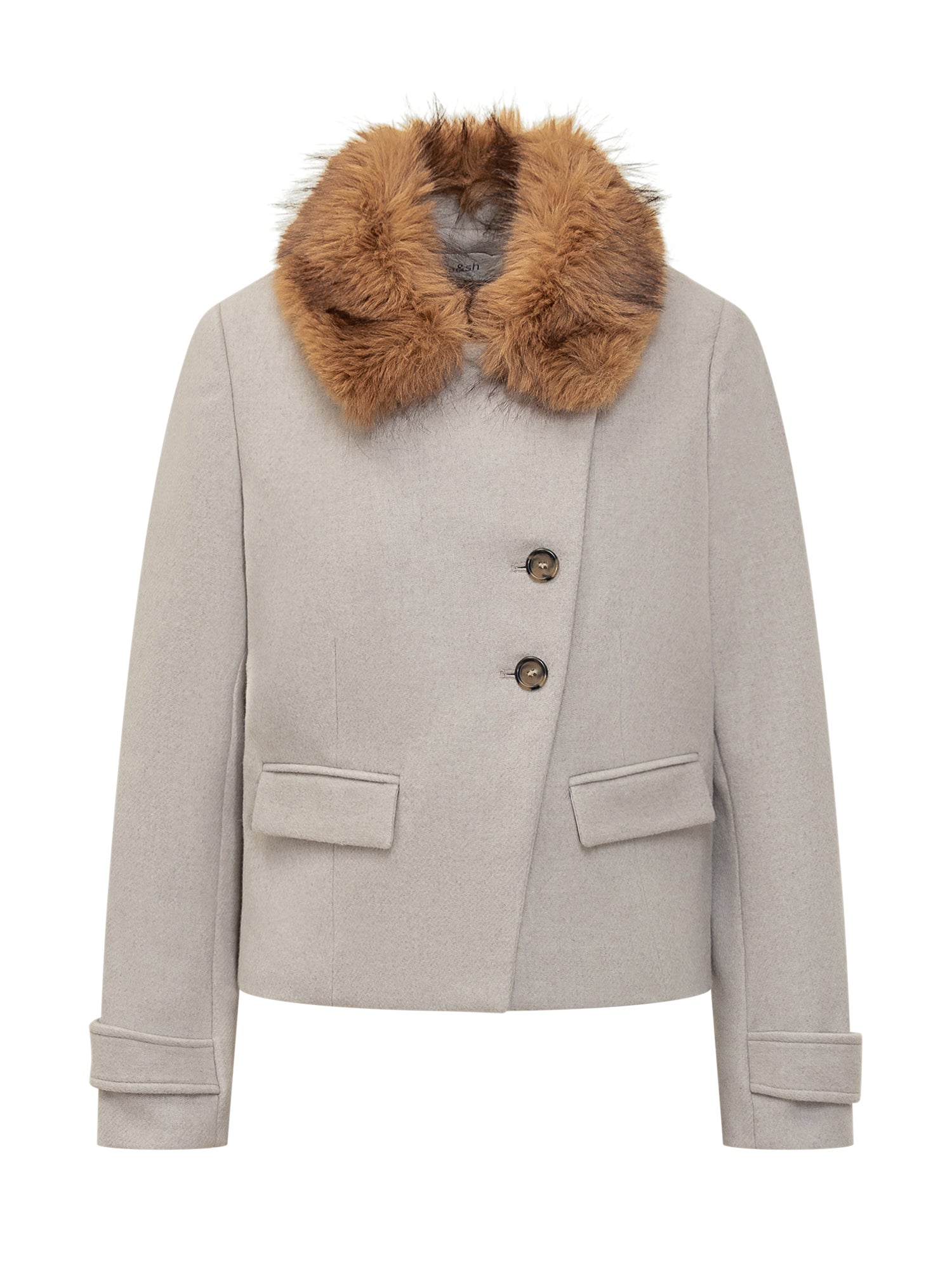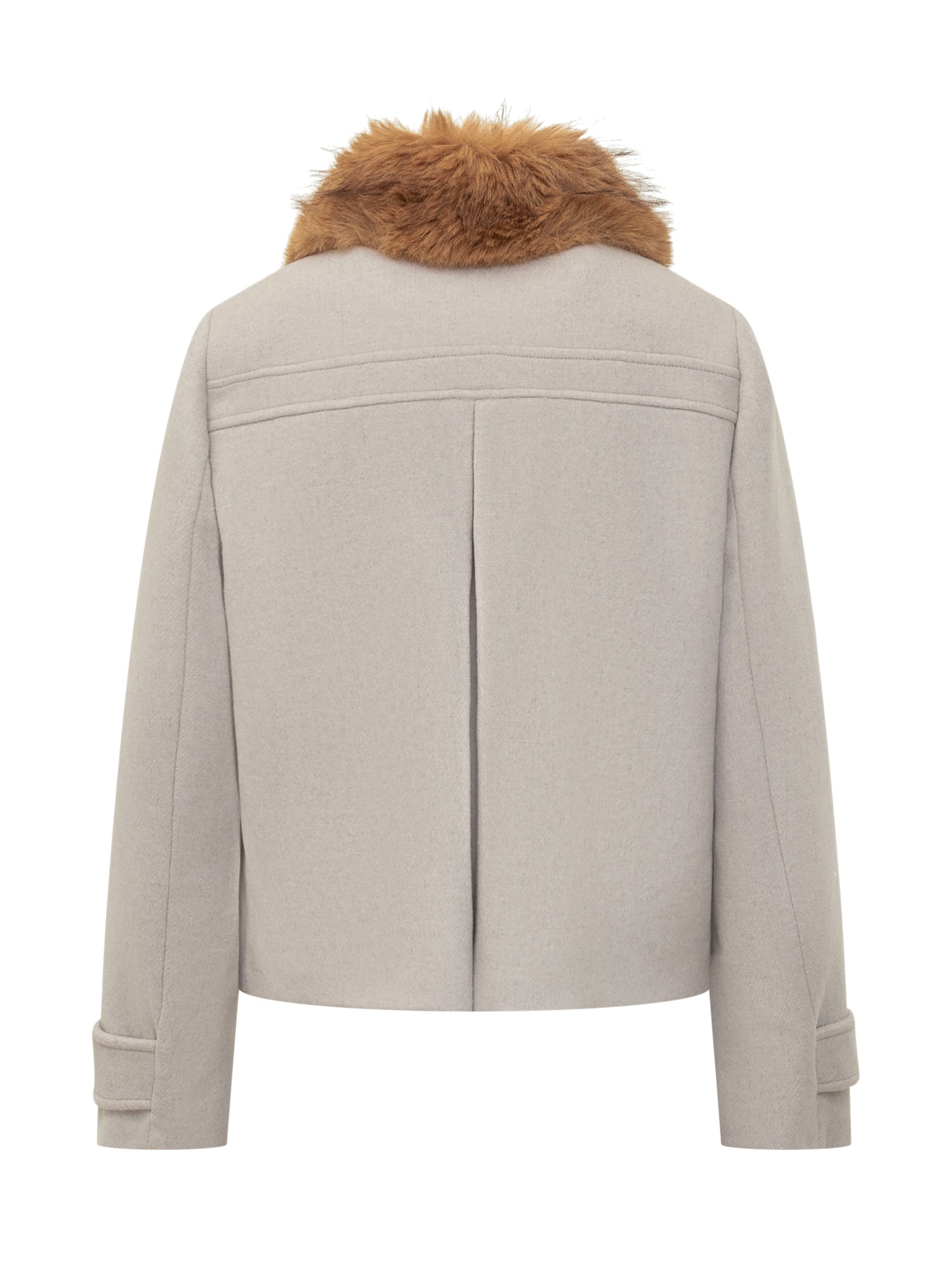 Ba&sh short beige wool jacket with caramel faux fur collar. Double-breasted design with front buttons and flap pockets.