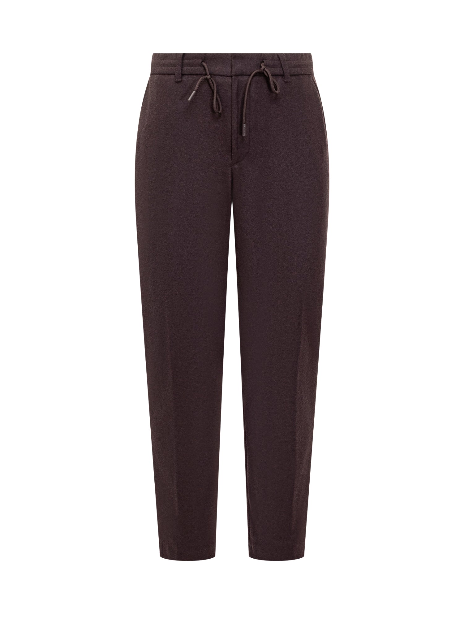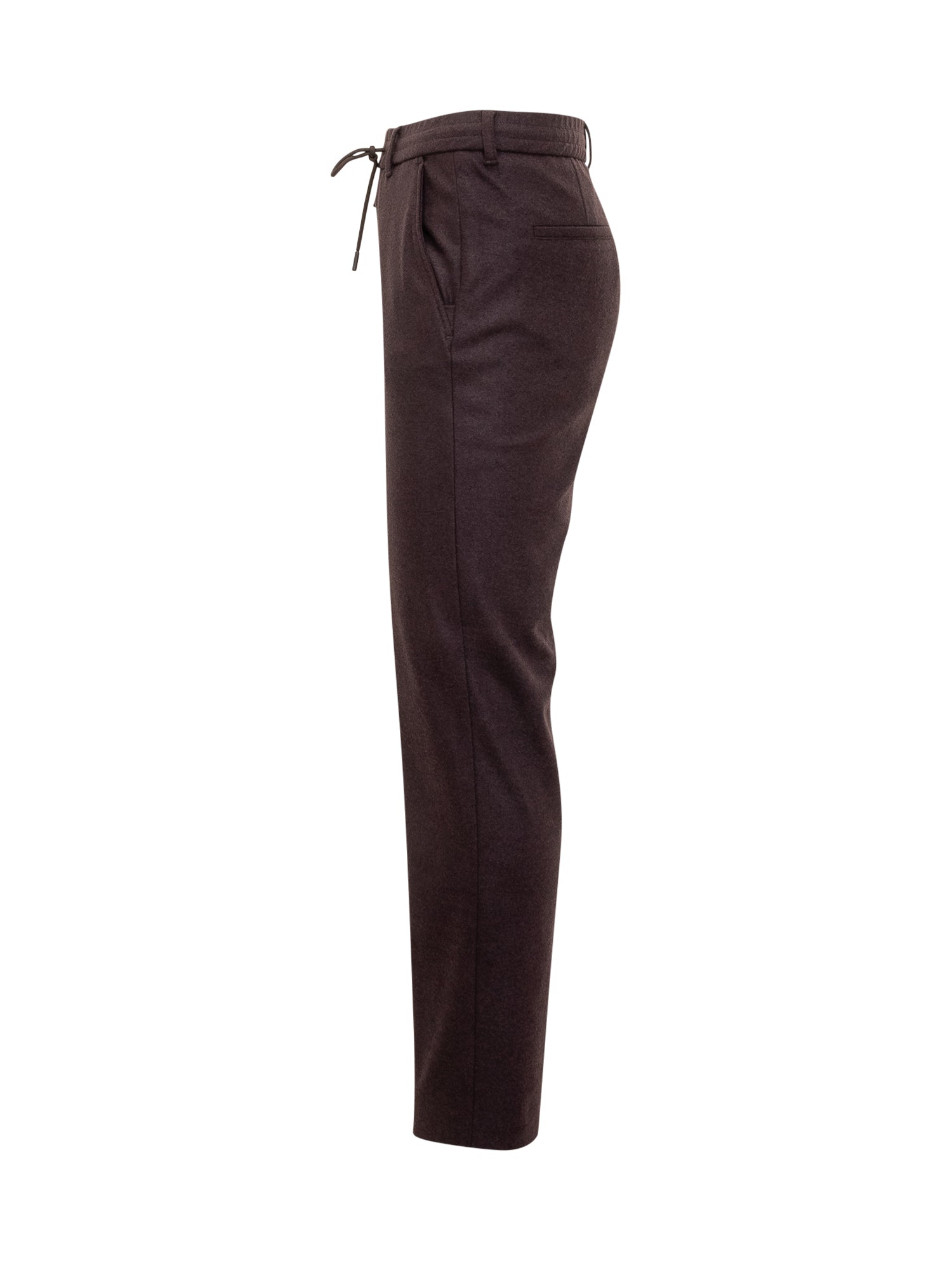 Boss brown trousers with adjustable drawstring waist, zip and button closure.