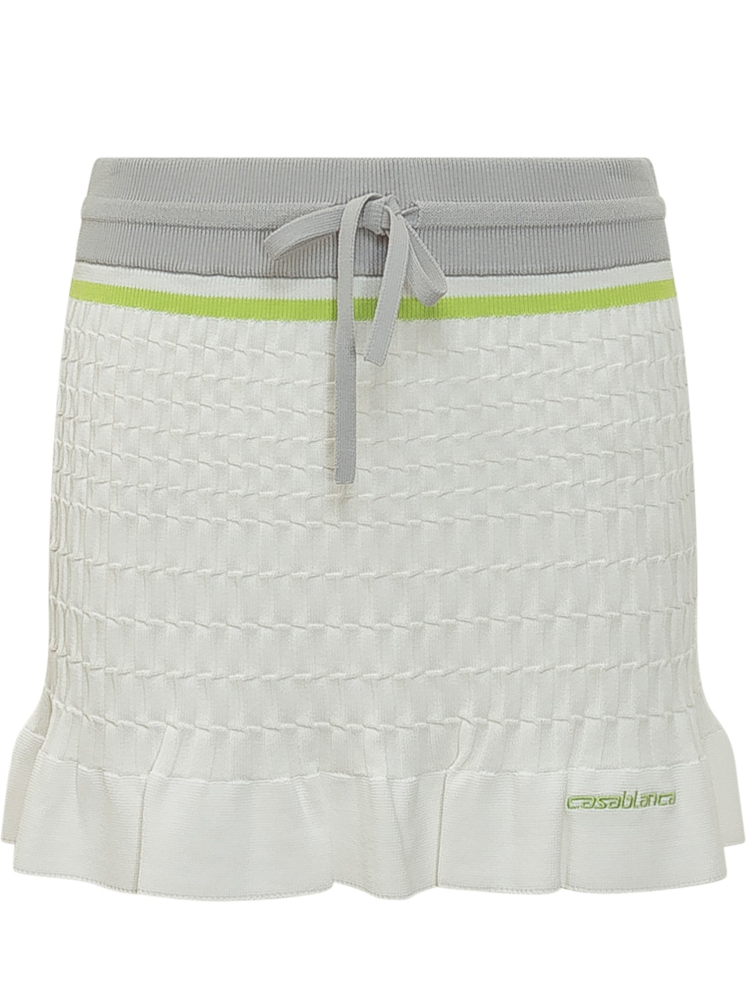 Midi knitted skirt with textured stitching and flounced hem. Ribbed waistband with adjustable drawstring for a comfortable sporty fit.