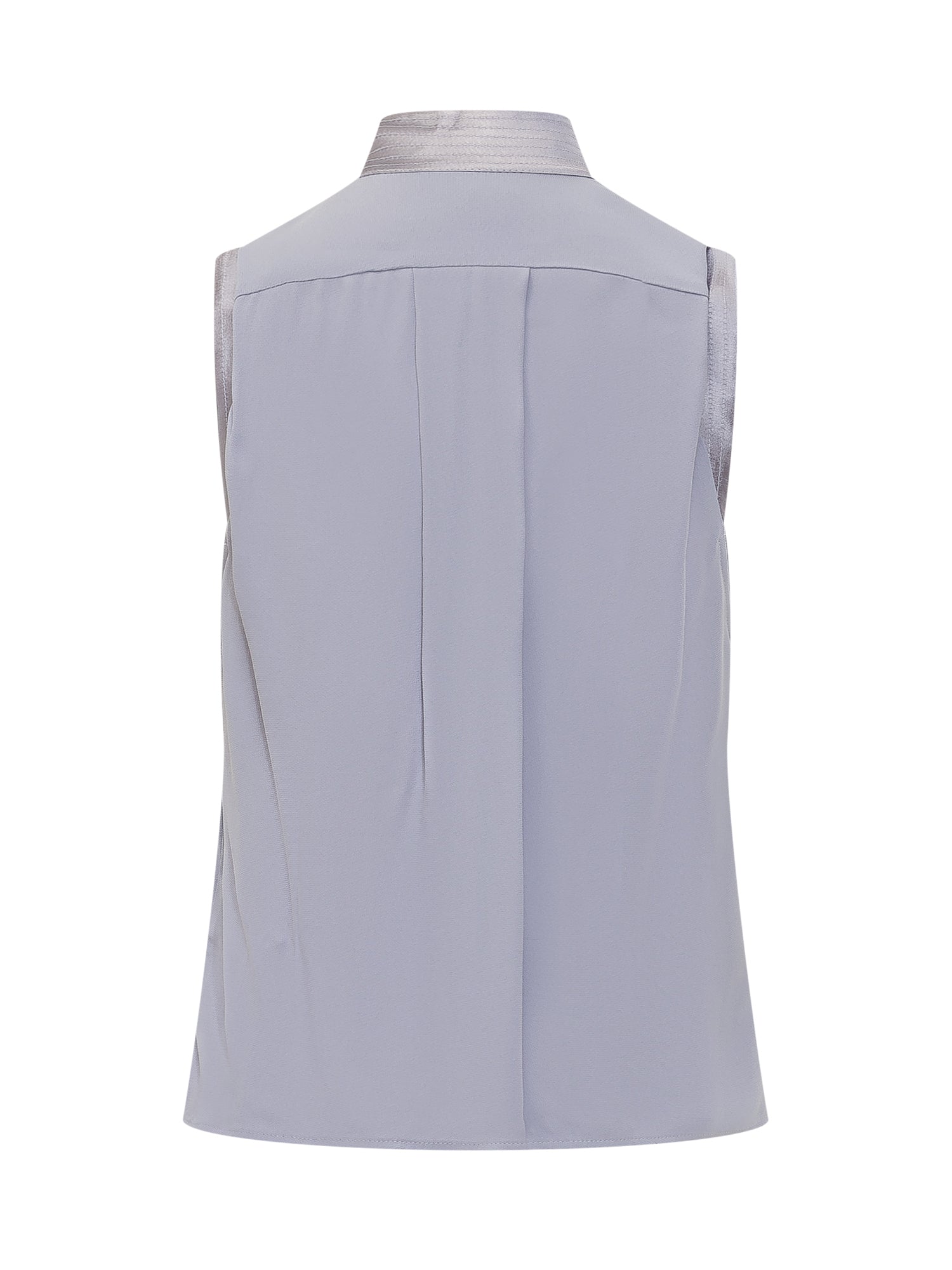 Sleeveless shirt with high neck, soft draped front neckline, button closure at the neck.