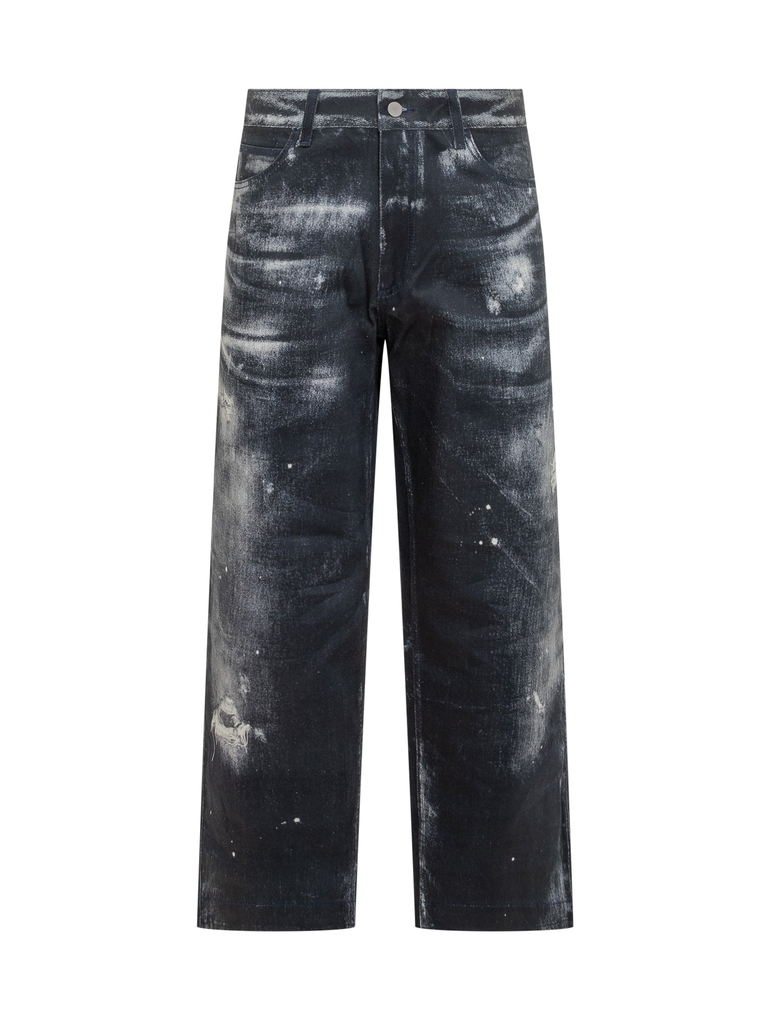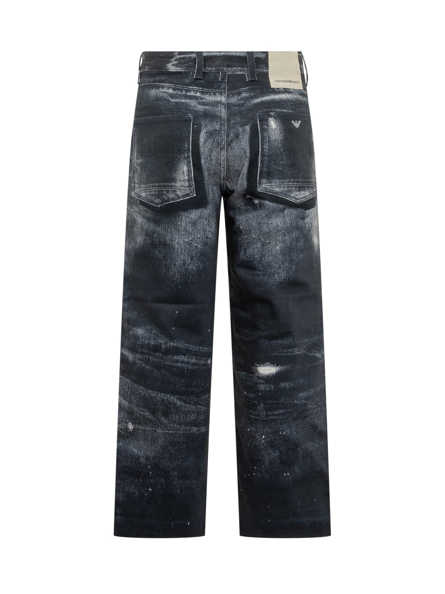 Emporio Armani wide-leg dark denim jeans with distressed effect and worn details.