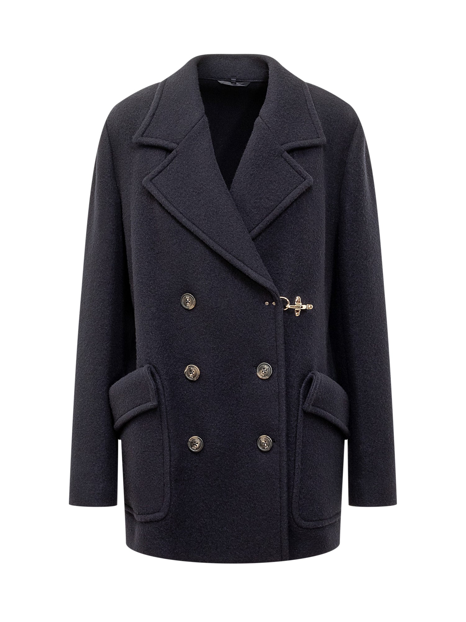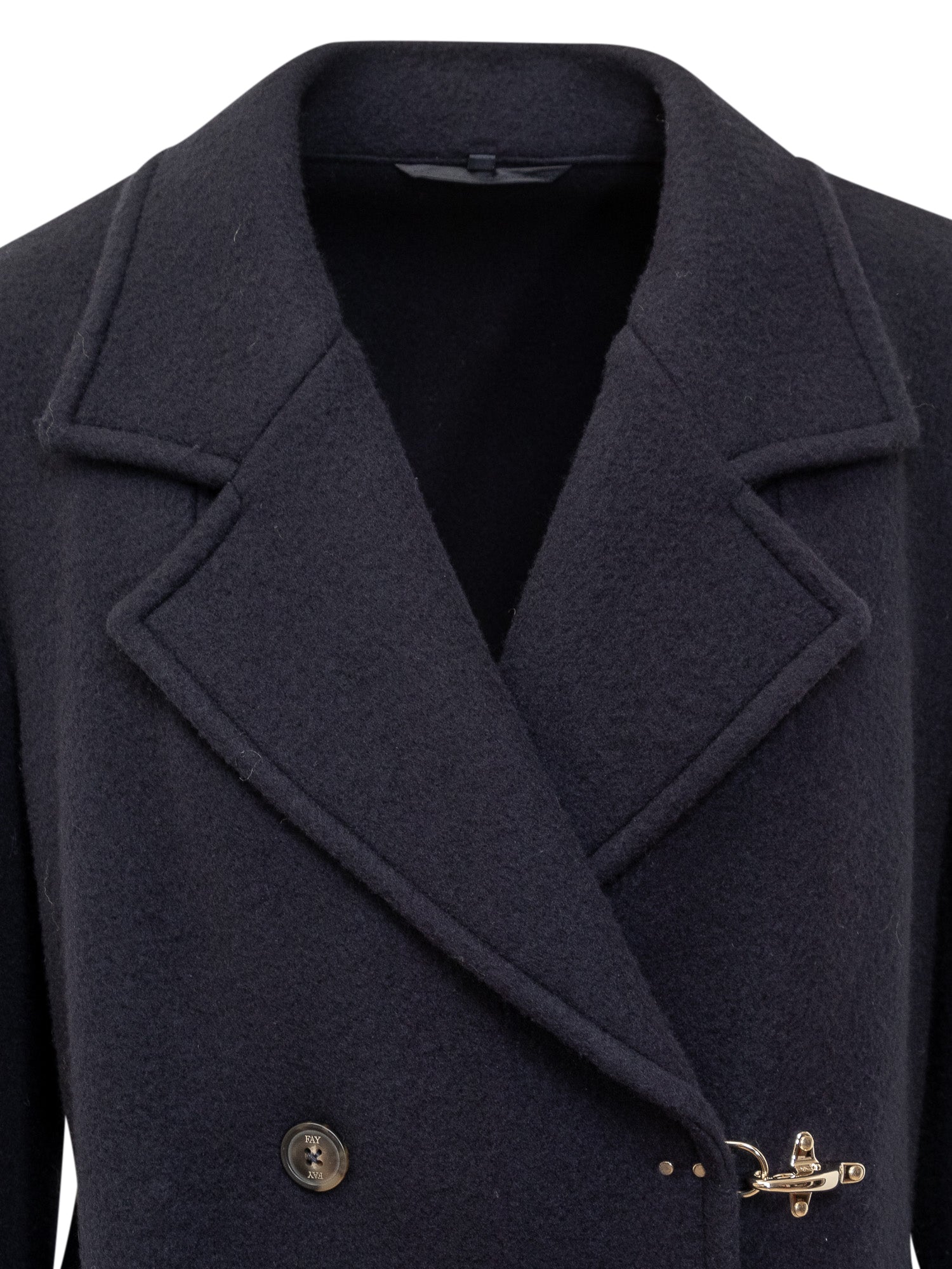 Blue wool coat. Lapel collar. Pockets with flap on the front. Closure with buttons and hook.