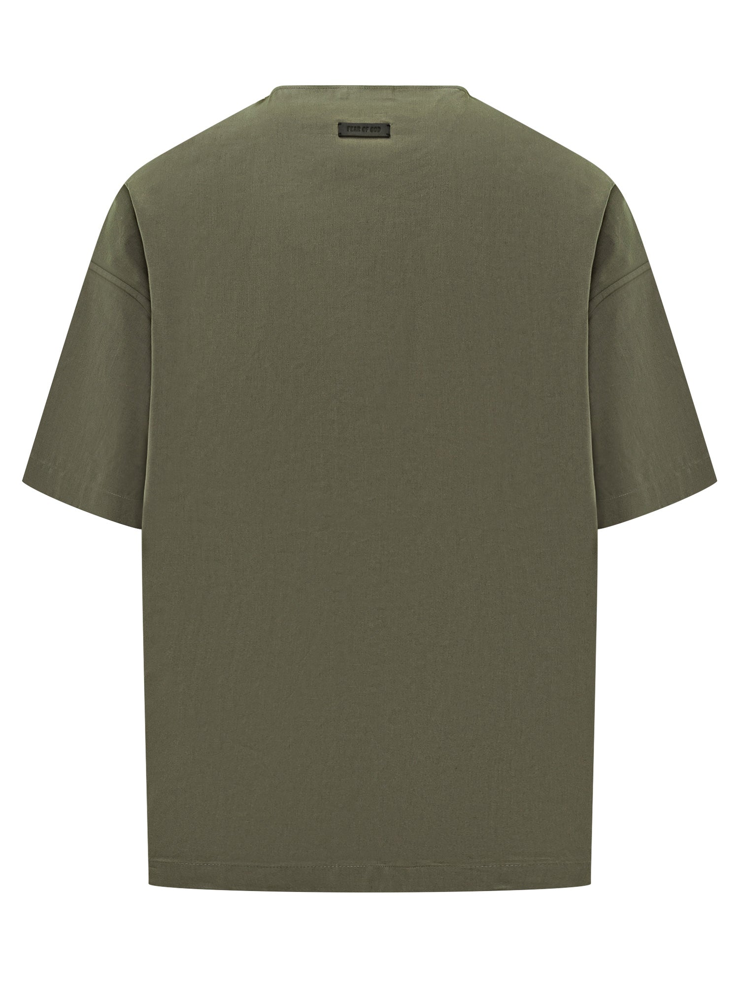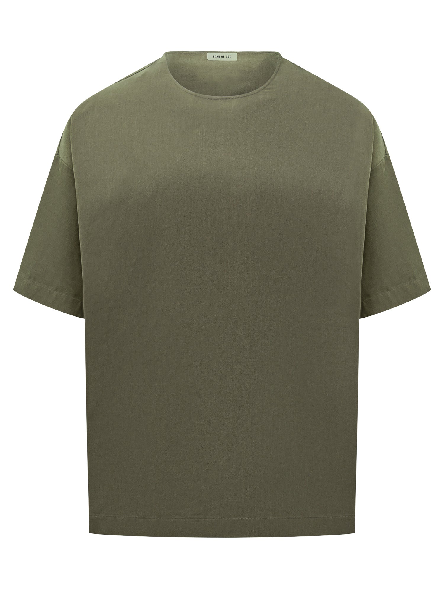 Fear of God Woven T-shirt in olive green cotton, featuring an oversized fit and soft textured fabric.